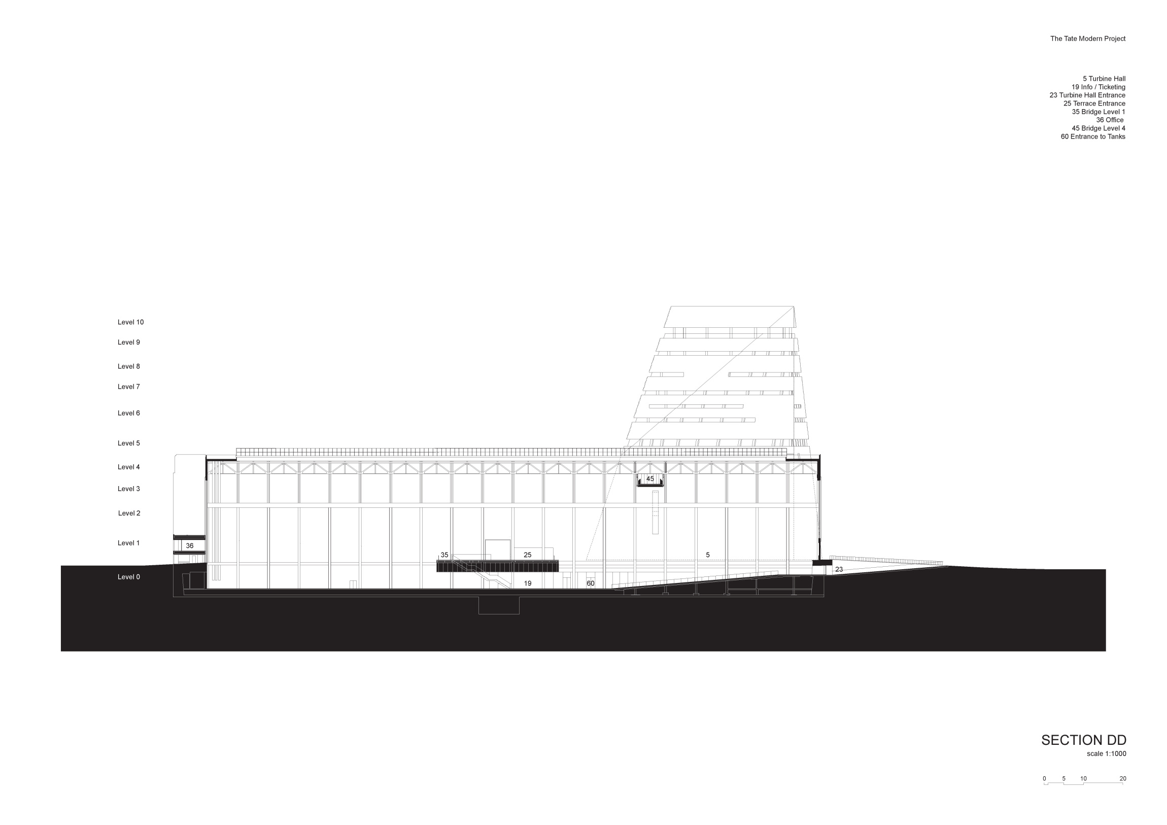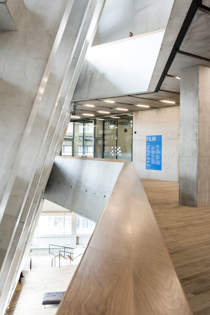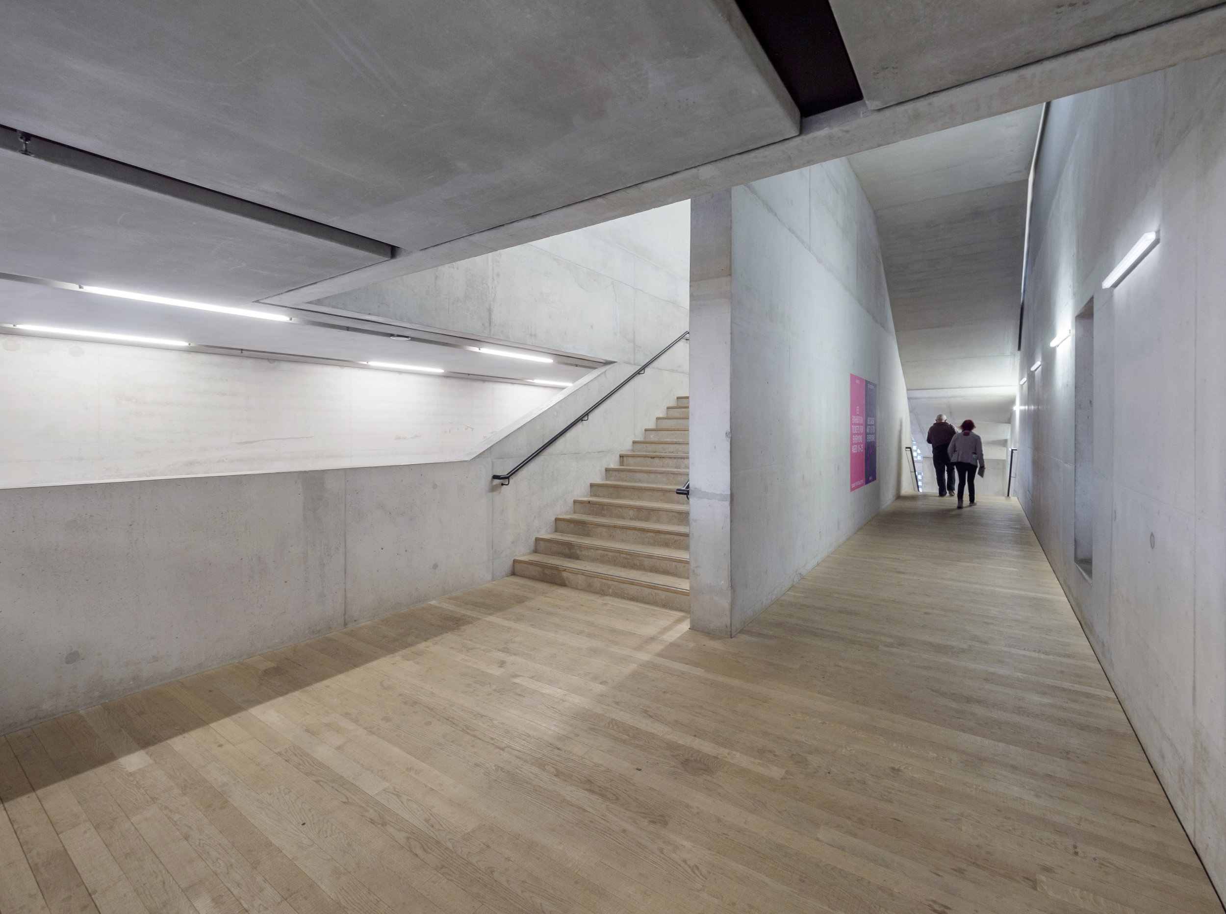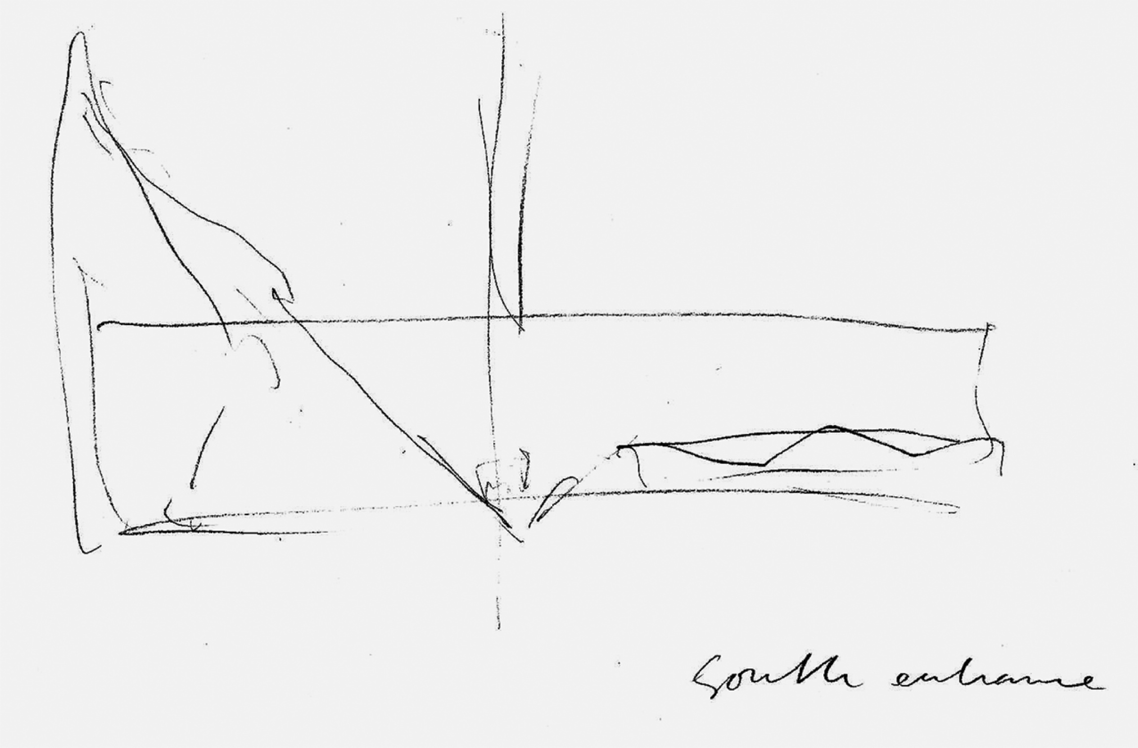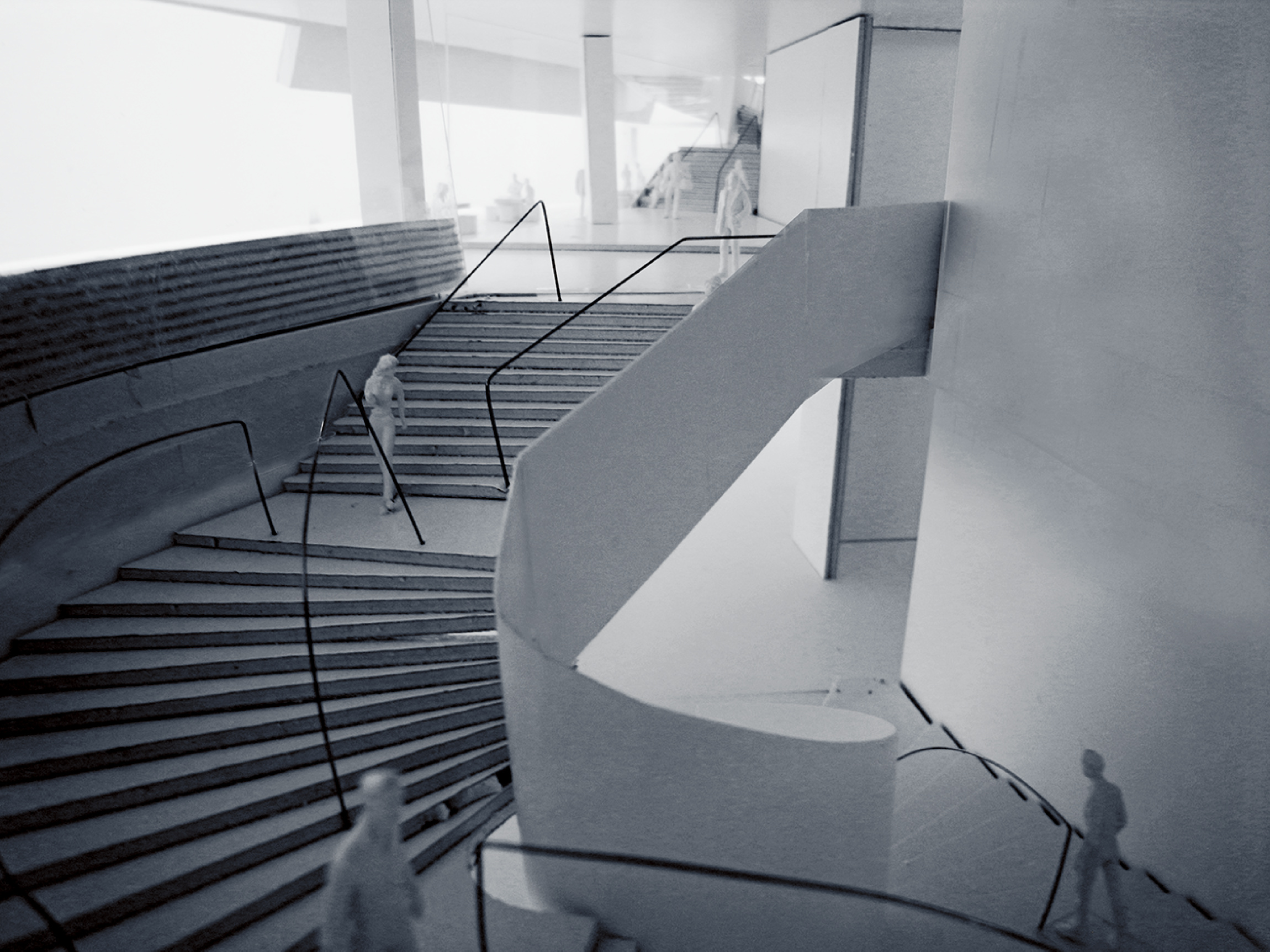 has entrances at all four points of the compass, and develops its own urban topography, which is also intended to accommodate art exhibitions and film shows. A ramp at the main entrance on the west side will take the anticipated two million