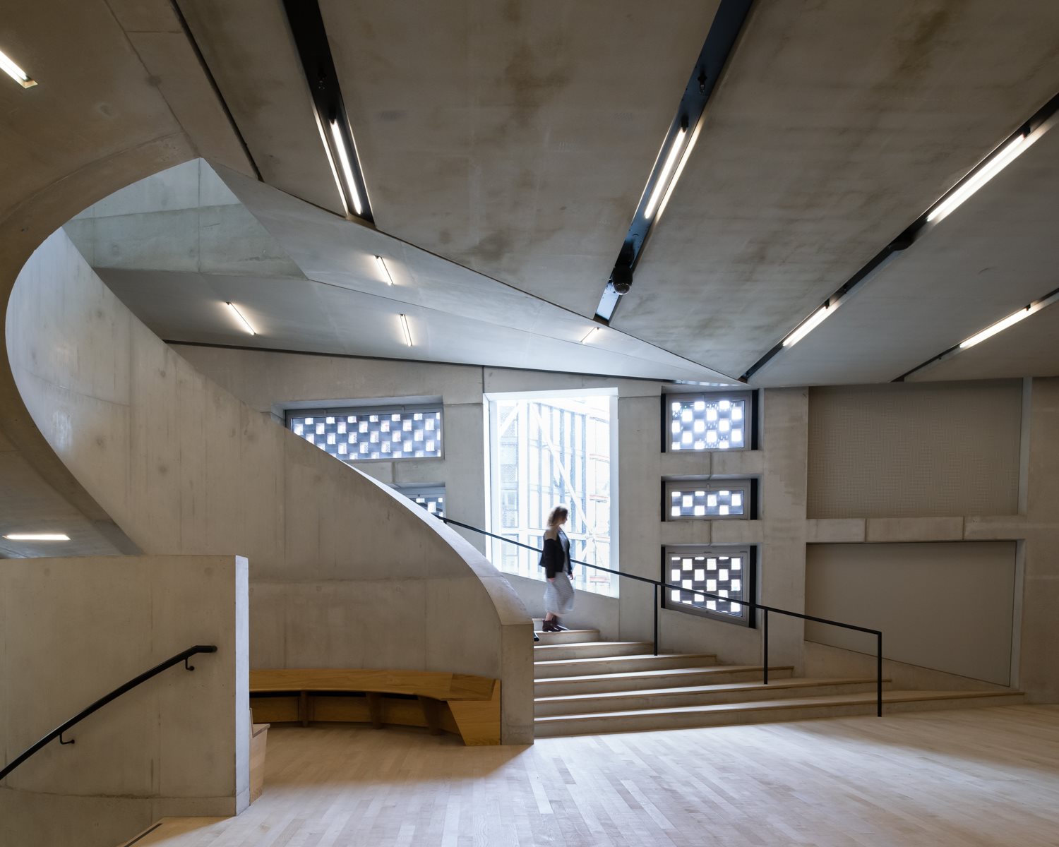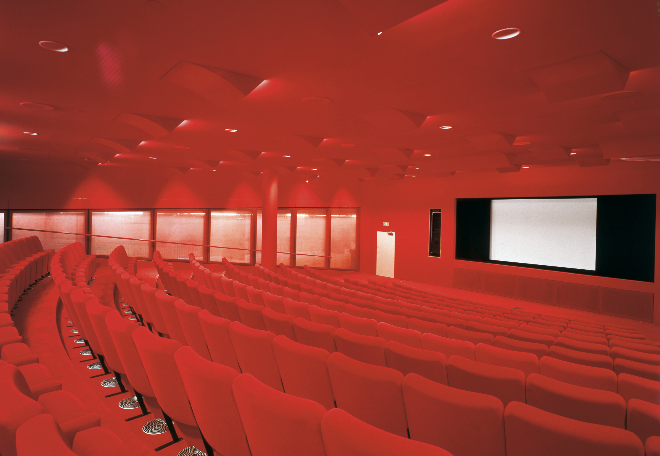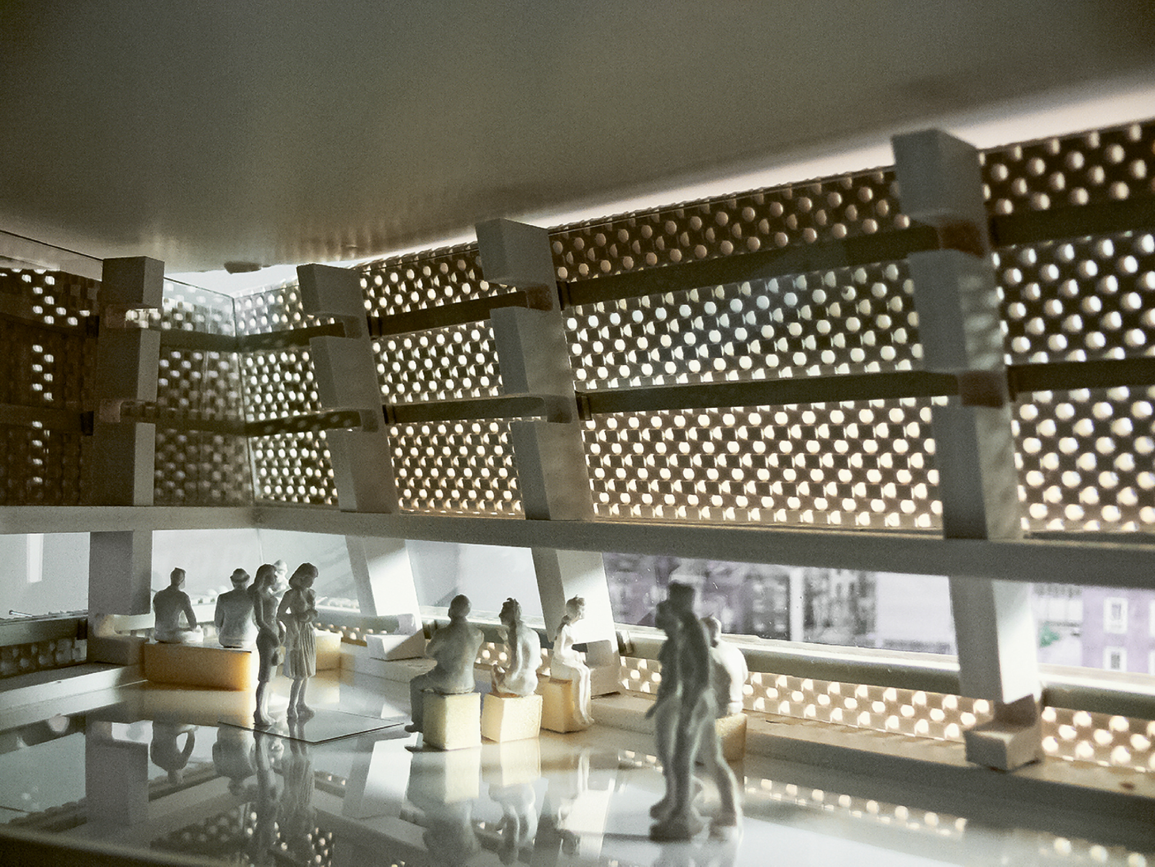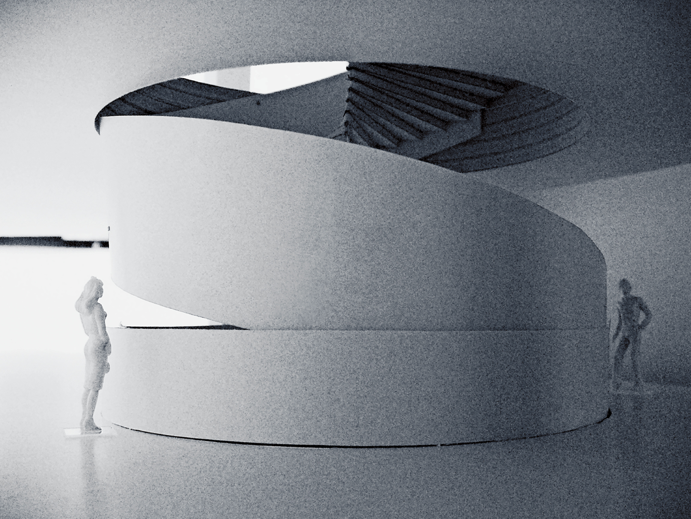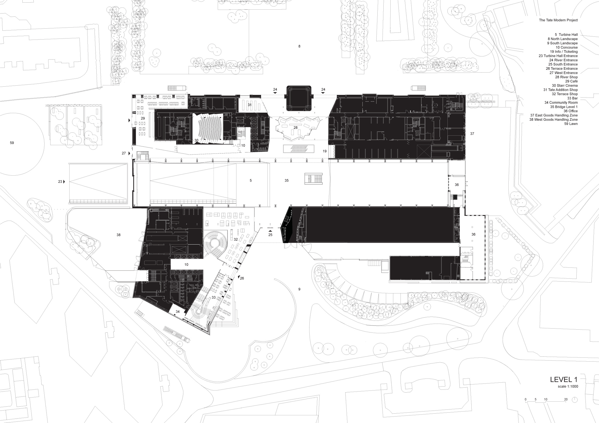 has entrances at all four points of the compass, and develops its own urban topography, which is also intended to accommodate art exhibitions and film shows. A ramp at the main entrance on the west side will take the anticipated two million