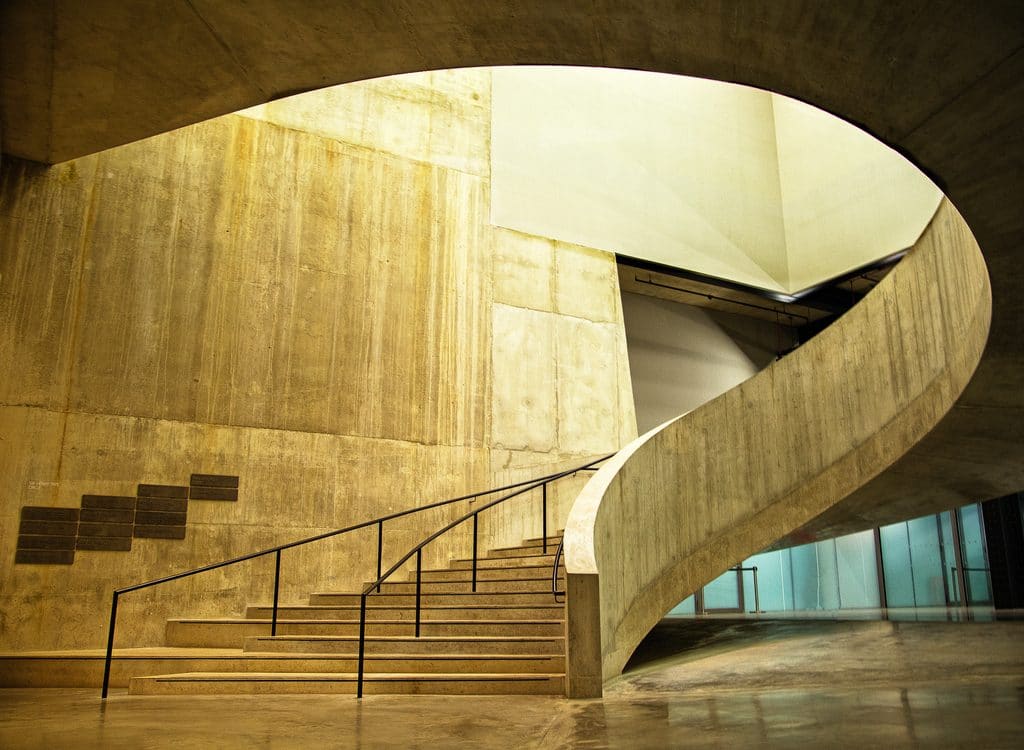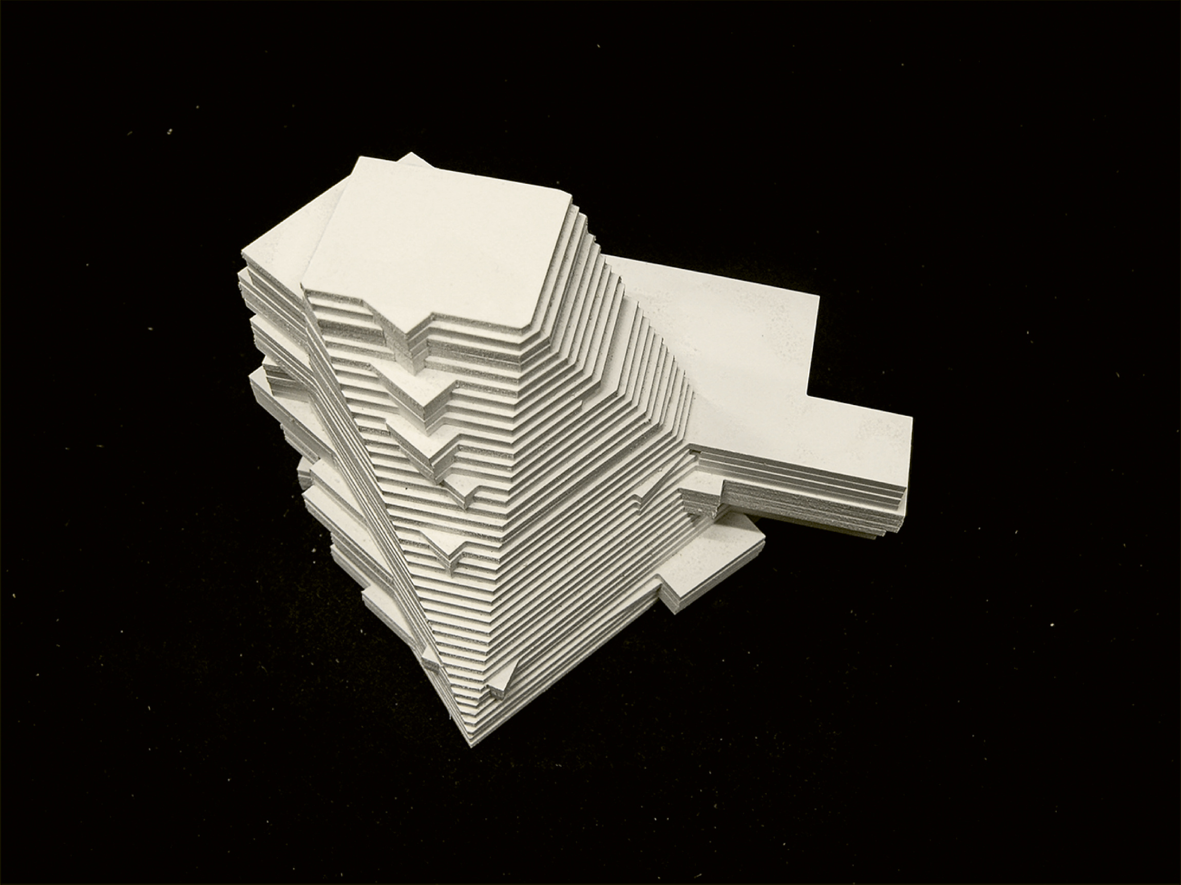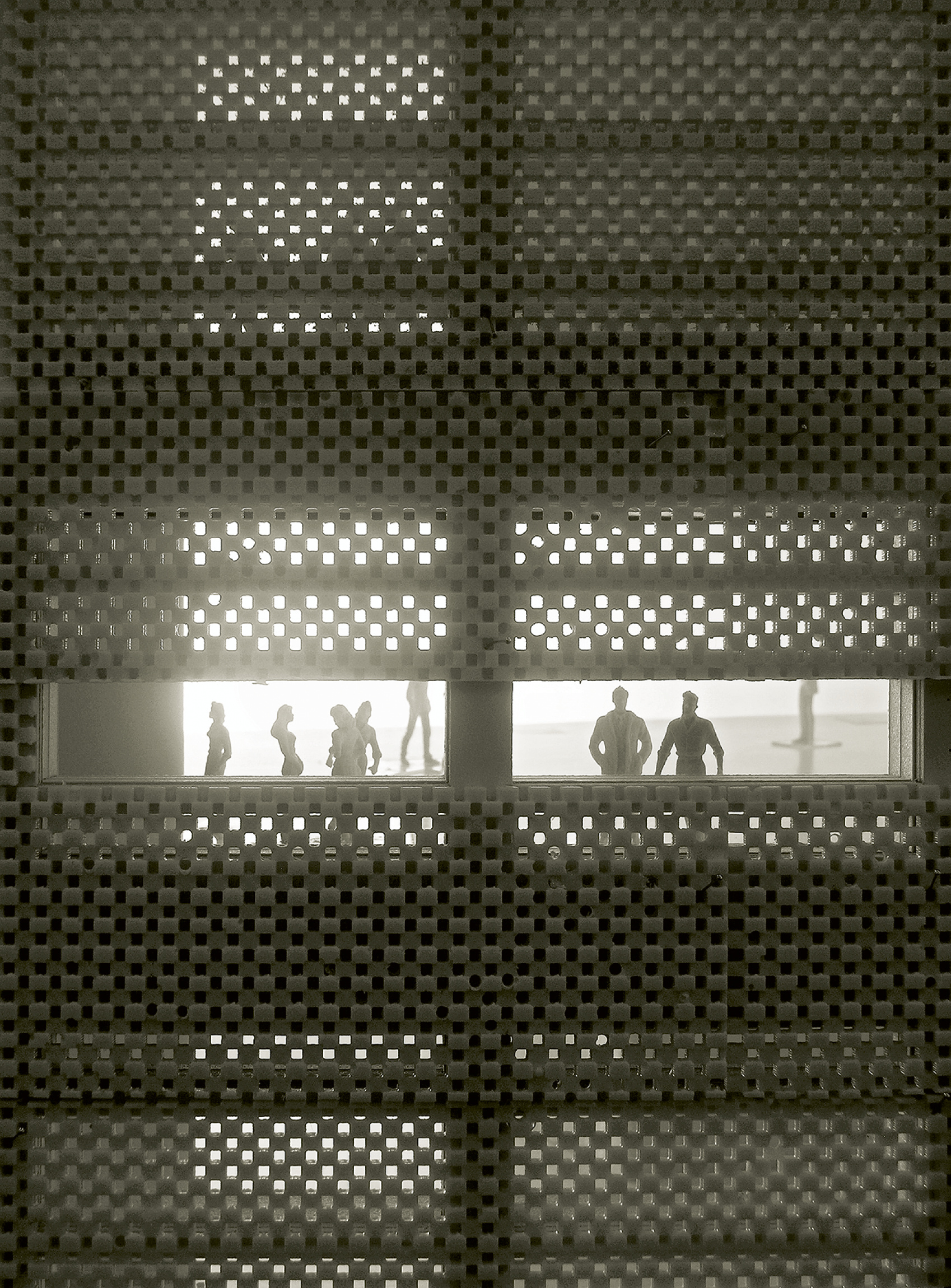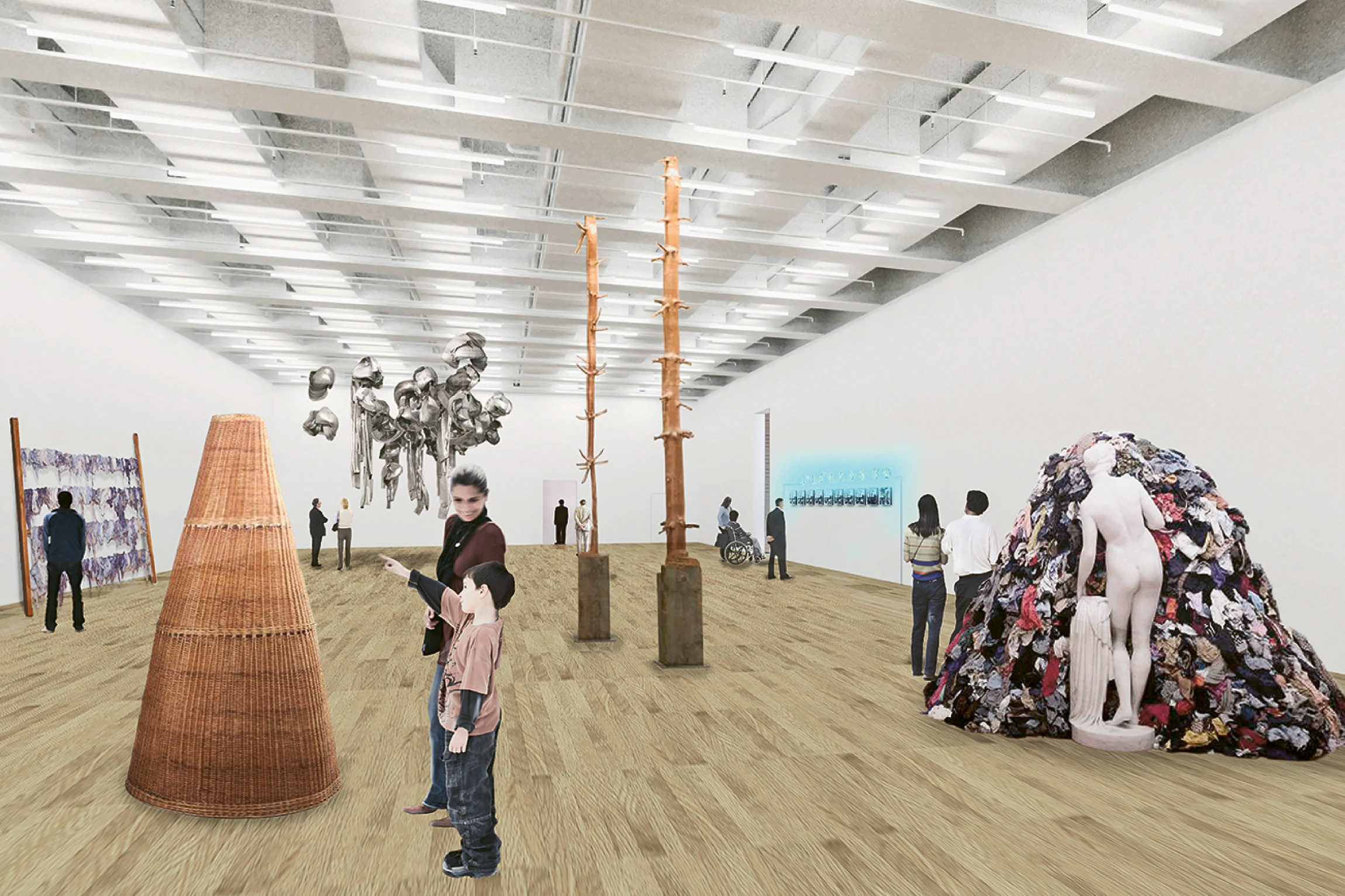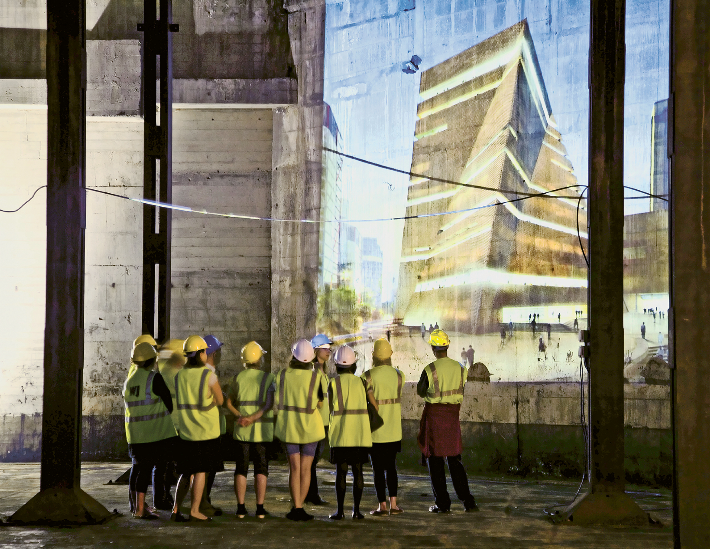 has entrances at all four points of the compass, and develops its own urban topography, which is also intended to accommodate art exhibitions and film shows. A ramp at the main entrance on the west side will take the anticipated two million