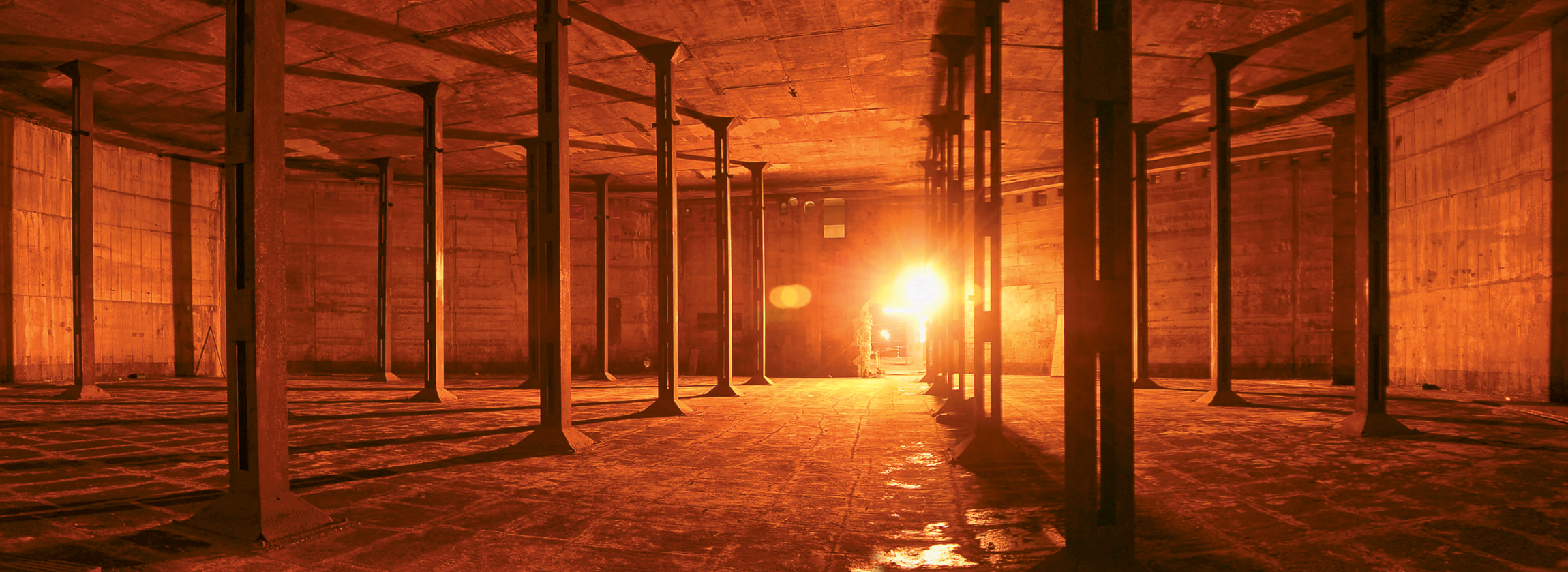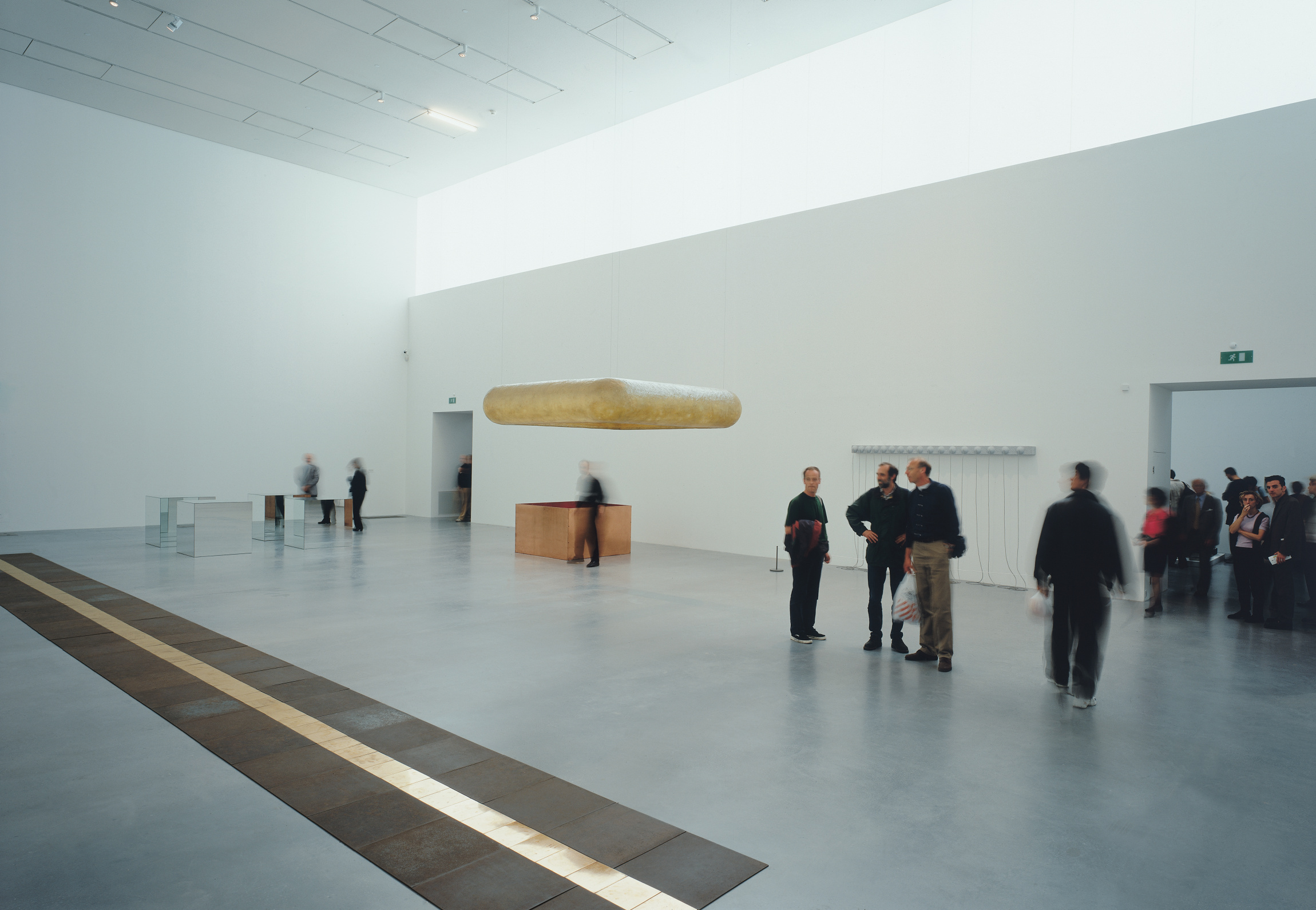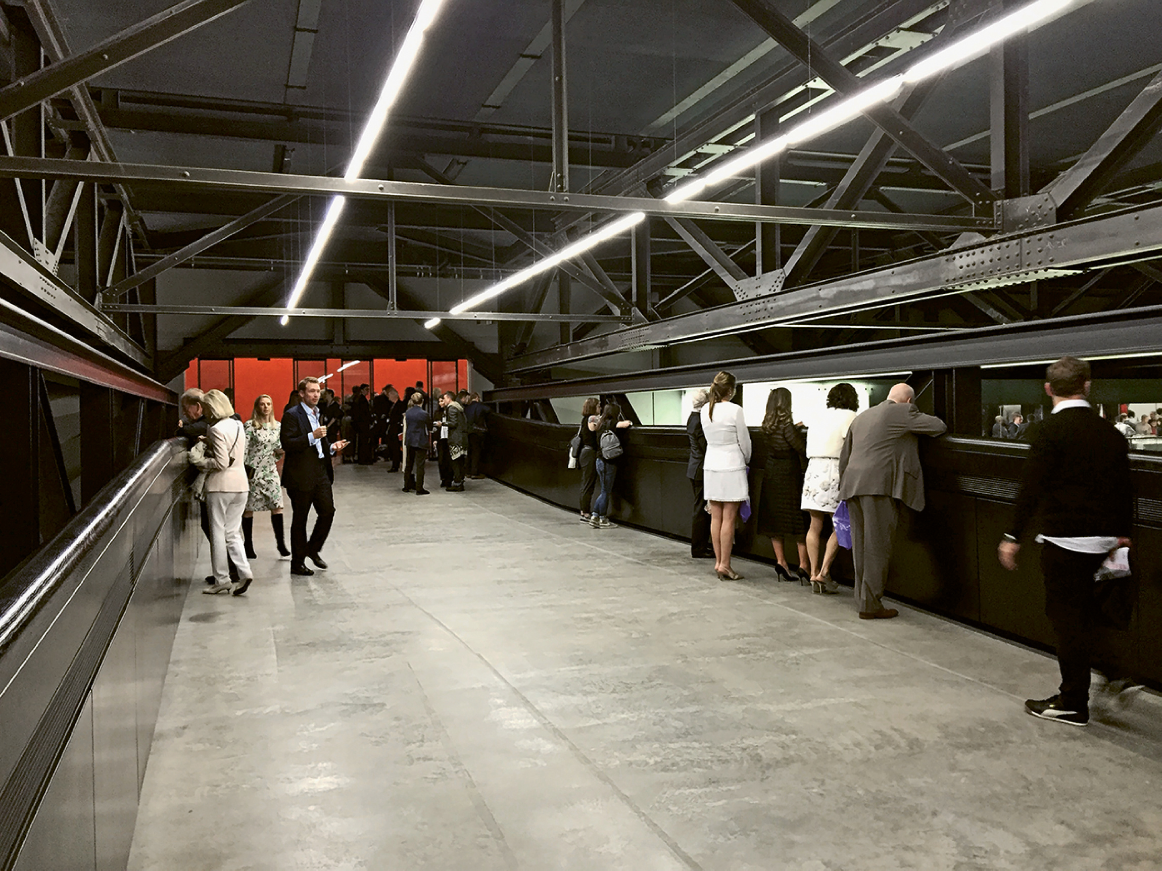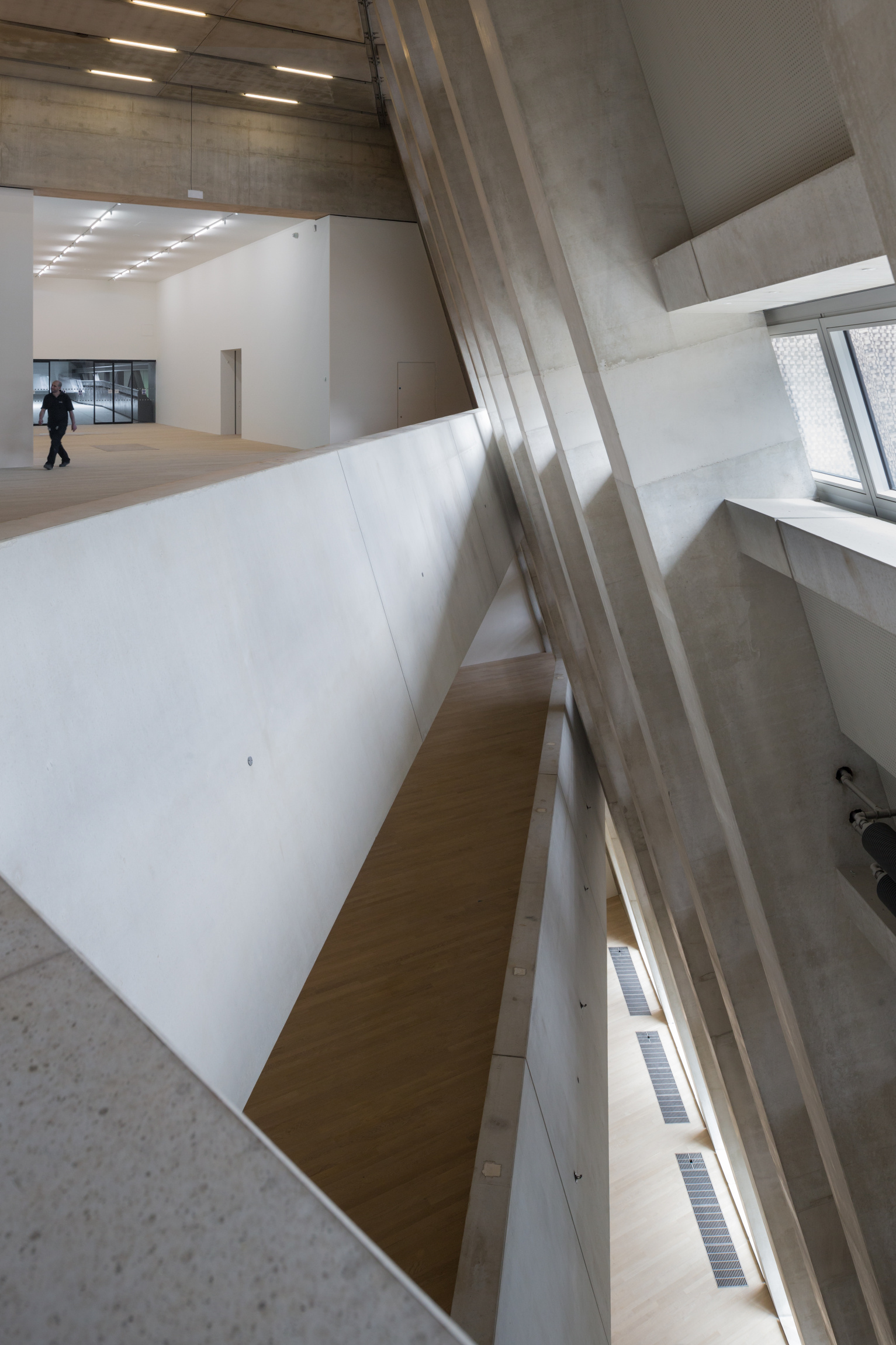visitors per year down into this hall. On the left, in the former boiler-house, are three floors containing 10,000 m2 of exhibition space, compactly stacked. On the right there is access to spaces