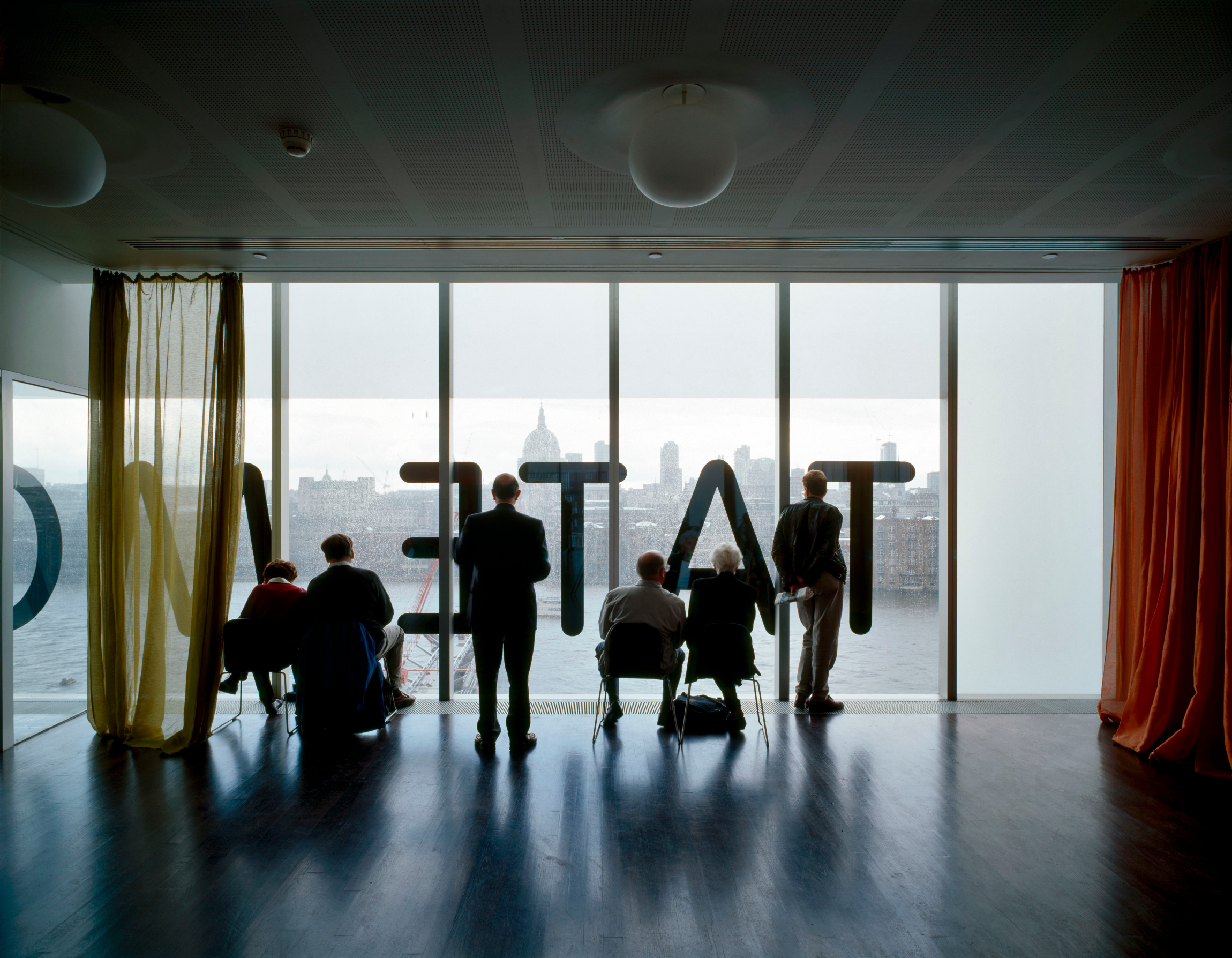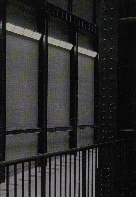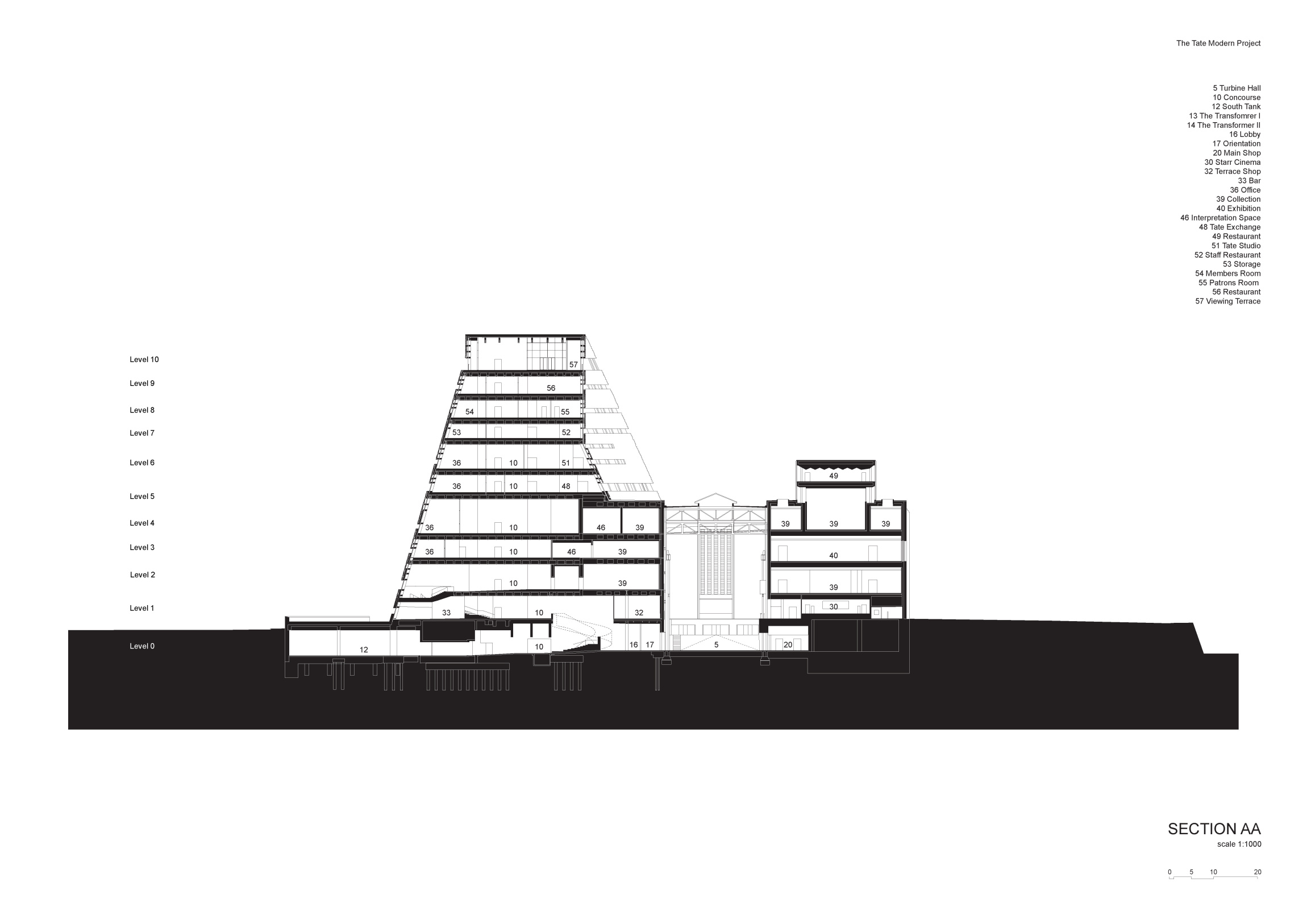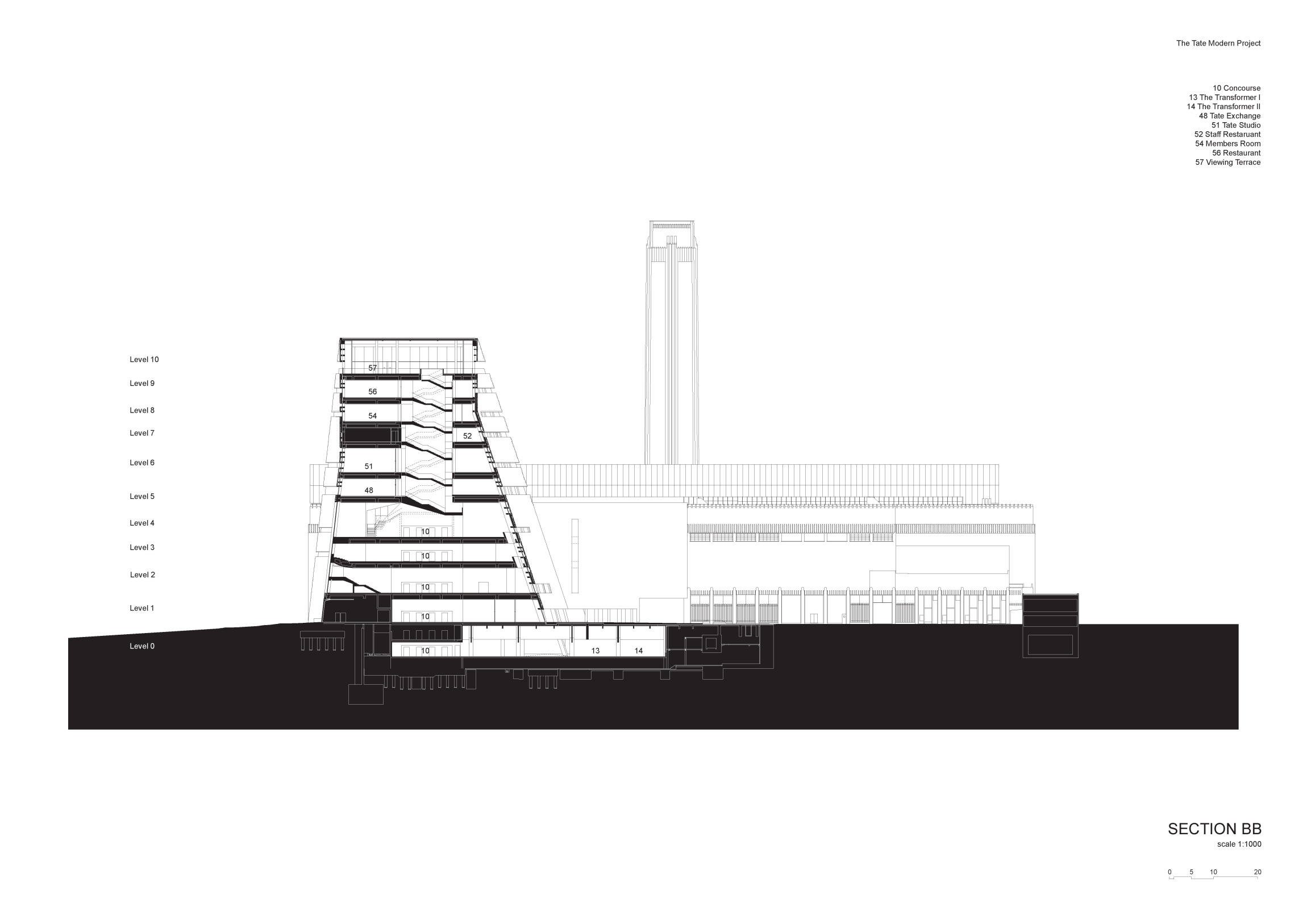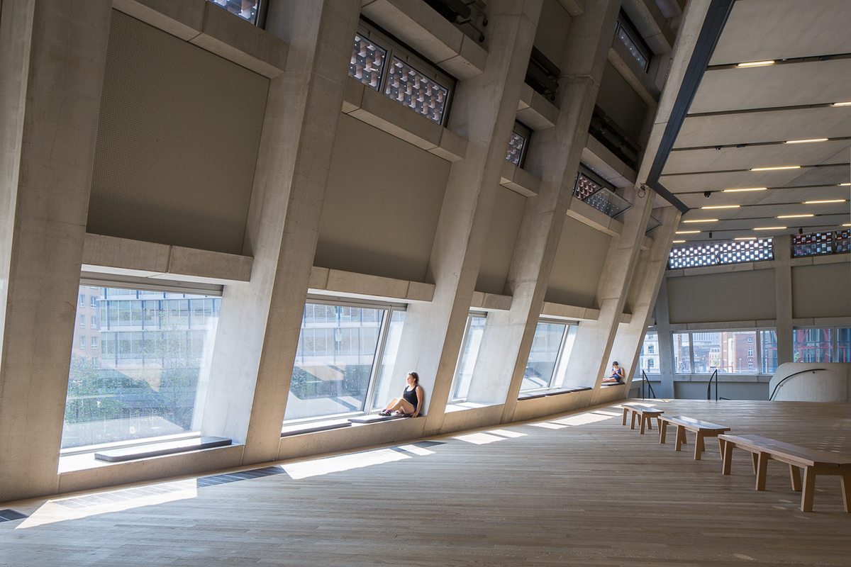 the Thames and the area immediately around the building to the public. The monumental quality of the building is emphasized on the outside by a two-storey "light strip" running the whole length of the brick building and adding an immaterial-