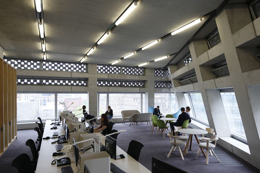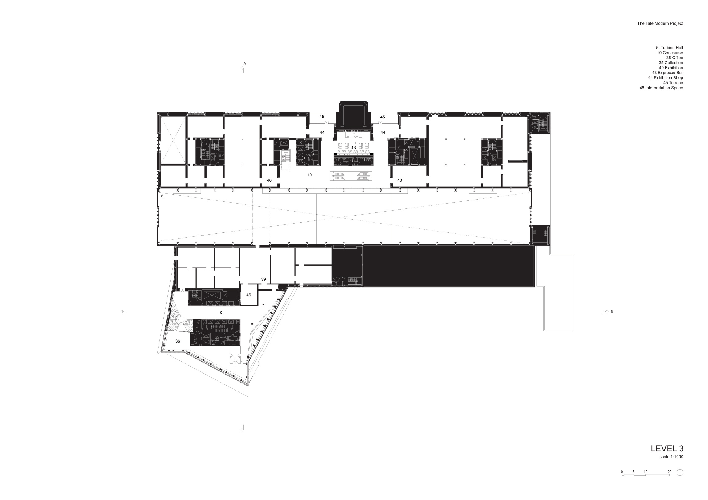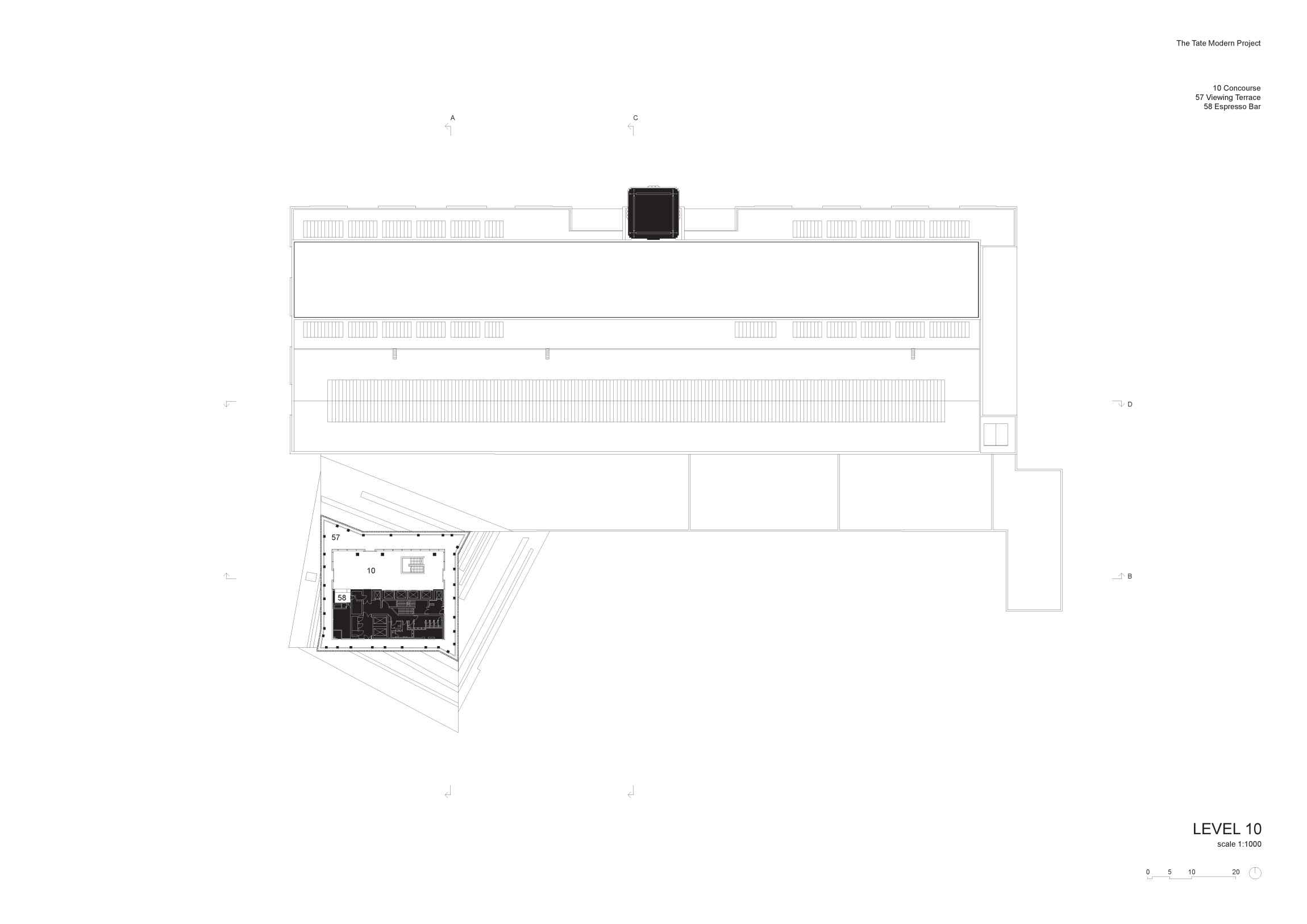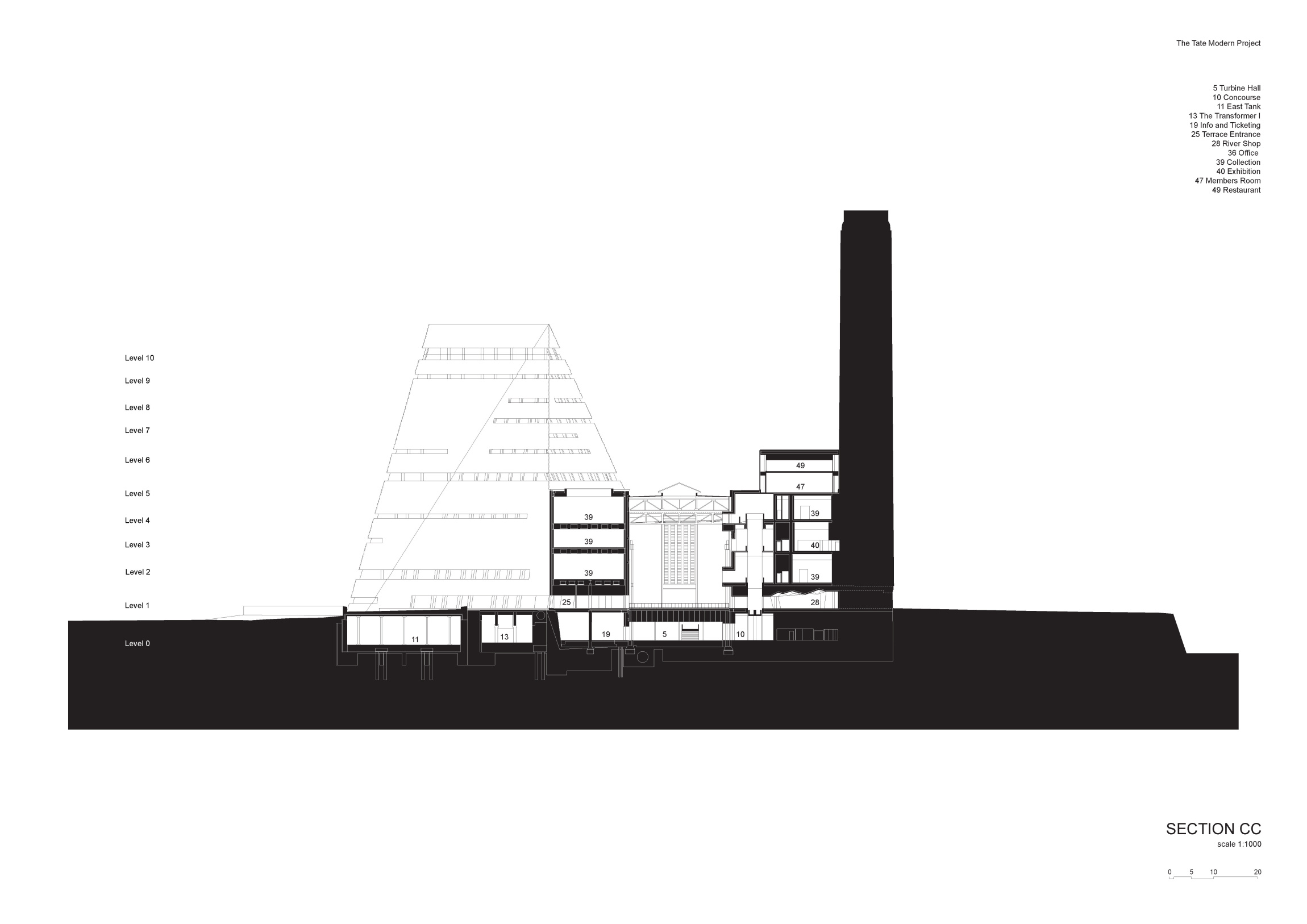 the Thames and the area immediately around the building to the public. The monumental quality of the building is emphasized on the outside by a two-storey "light strip" running the whole length of the brick building and adding an immaterial-