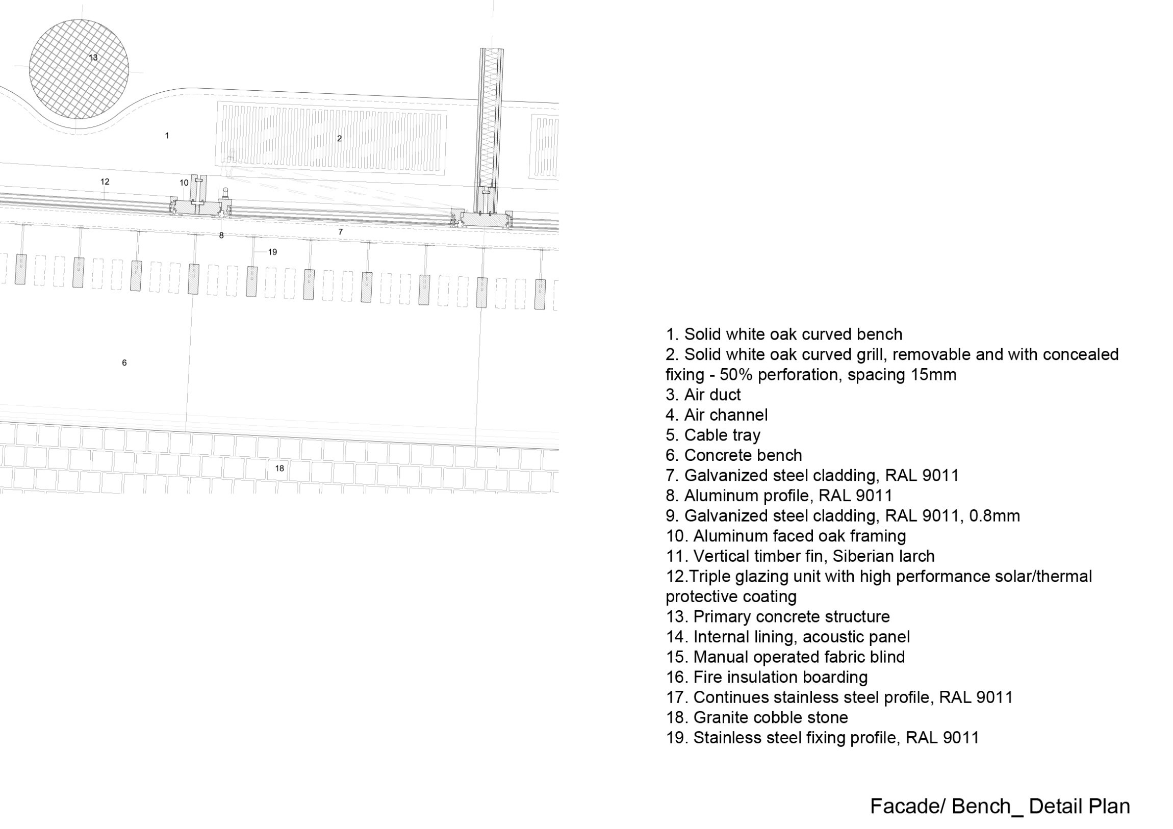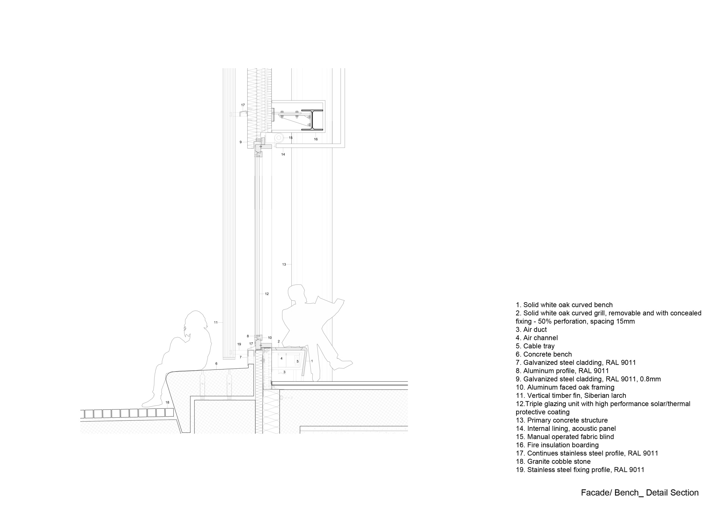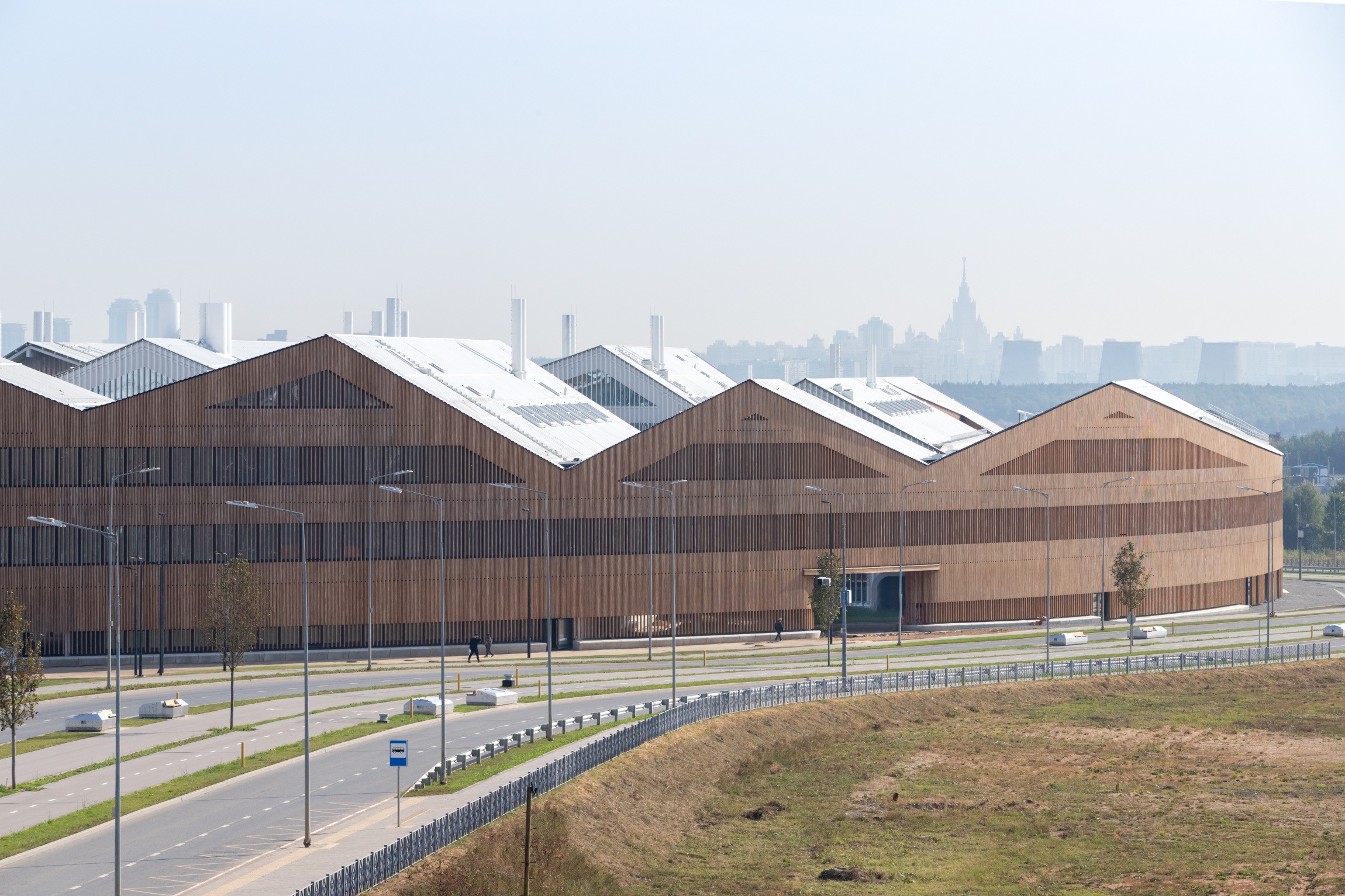 The University rings and blocks are clad with fins that control the daylight and unify the facades, giving them overall texture and depth. Finish materials distinguish the rings and blocks on the inside and outside. The rings have natural oak floor and wall systems in the interior, and Siberian larch fins on the exterior, while the blocks have industrial vinyl floor and aluminum wall systems in the labs, and white aluminum fins on the exterior. The building envelope is unified by a continuous concrete bench at the base and by connected sloping roofs at the top which, along with the overall facade, bring together all the elements into one integrated whole and set the University apart from the other buildings in the master plan. The scheme nonetheless remains fully integrated with its surroundings. Skoltech is integrated, permeable, and monumental at the same time, by virtue of its low-rise architecture, numerous openings and views on the interior, a series of publically accessible courtyards, and traditional materials. |