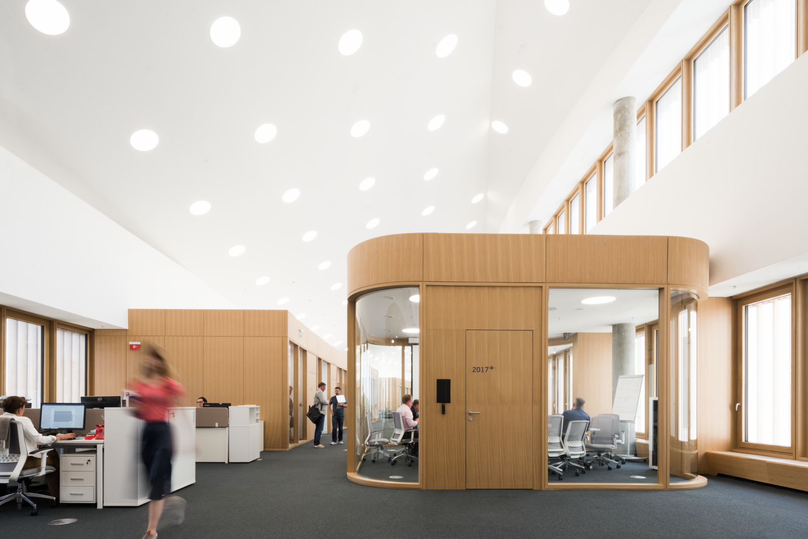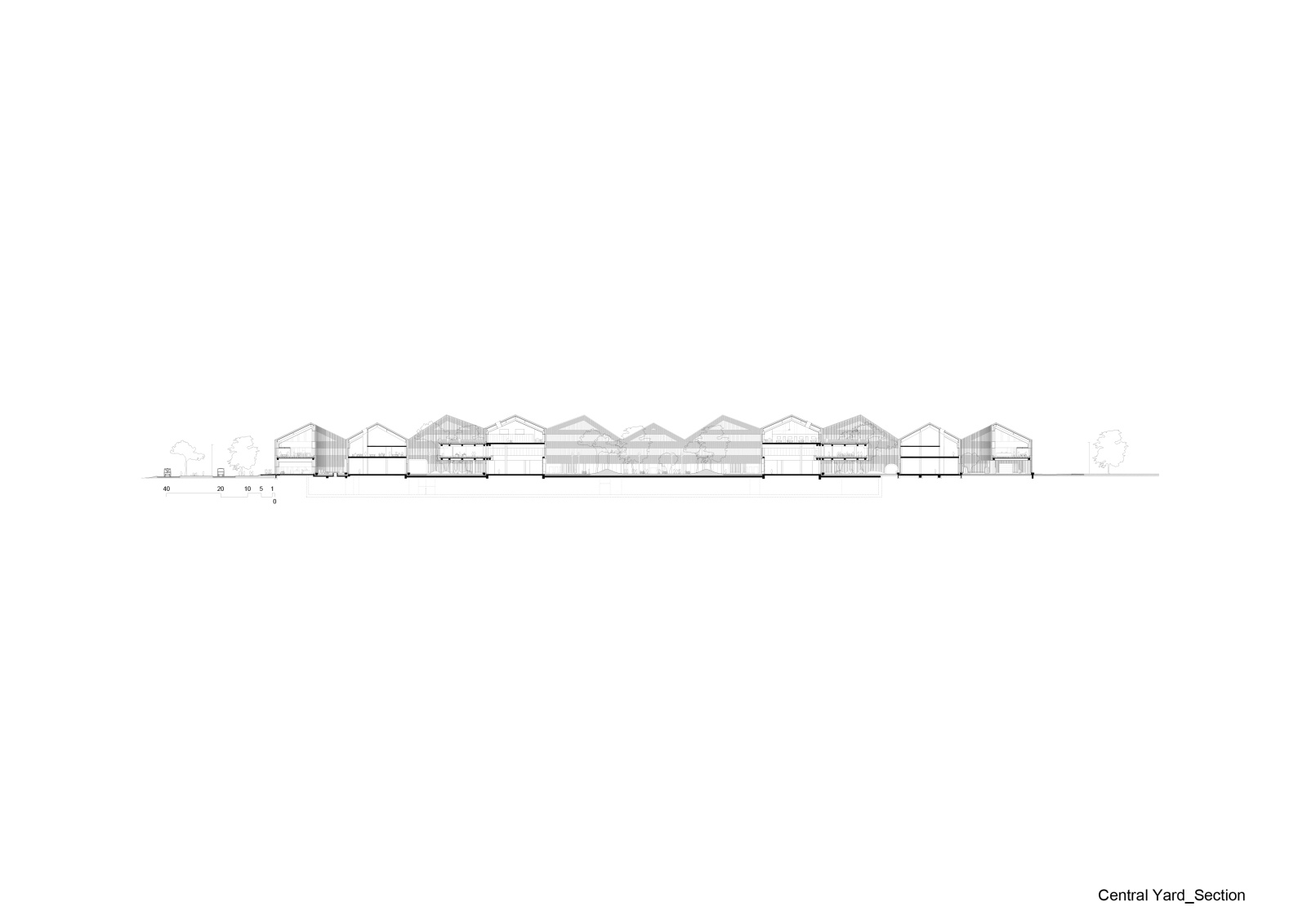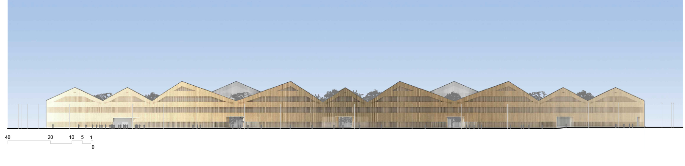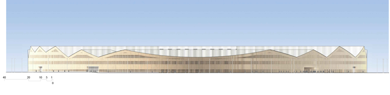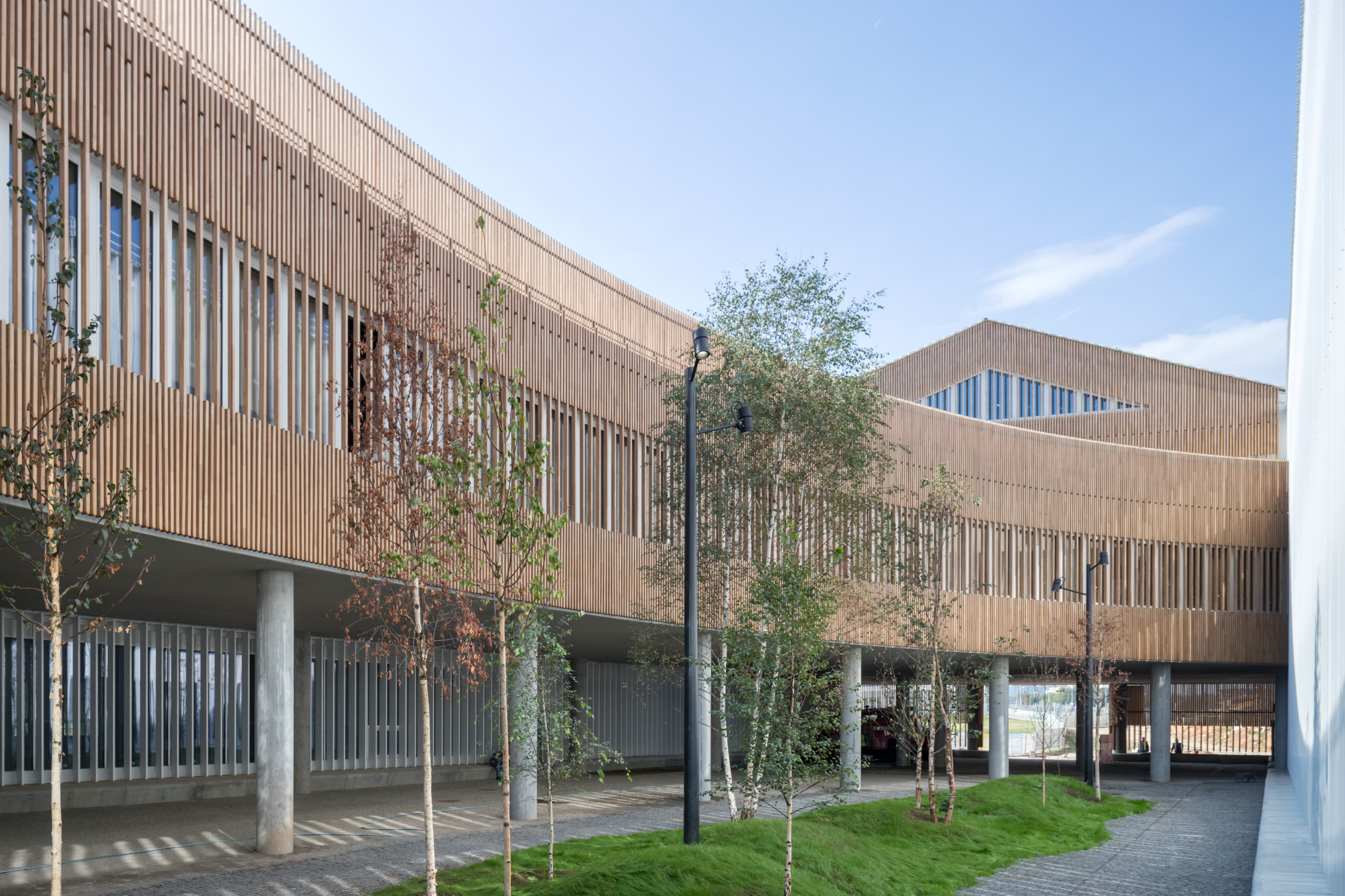A rational grid of rectangular and repetitive blocks is laid out in a checkerboard pattern to house laboratories and workshops related to the academic research activities. To optimize daylight the blocks are oriented east-west. The lab blocks are based on a 7 by 7 metre planning and structural grid, and have uniform widths of 21 or 28 metres, with varying lengths. These repetitive orthogonal shapes offer the efficiency and simplicity of rational modular layouts, combined with the flexibility and adaptability generally required for laboratory and workshop spaces. Additional research facilities, loading, logistics, and technical areas are located in the continuous basement floor beneath the entire building. The laboratories and workshops complete the University’s academic area, forming a platform for interconnected departments and shared facilities.
