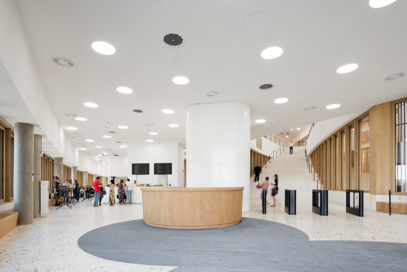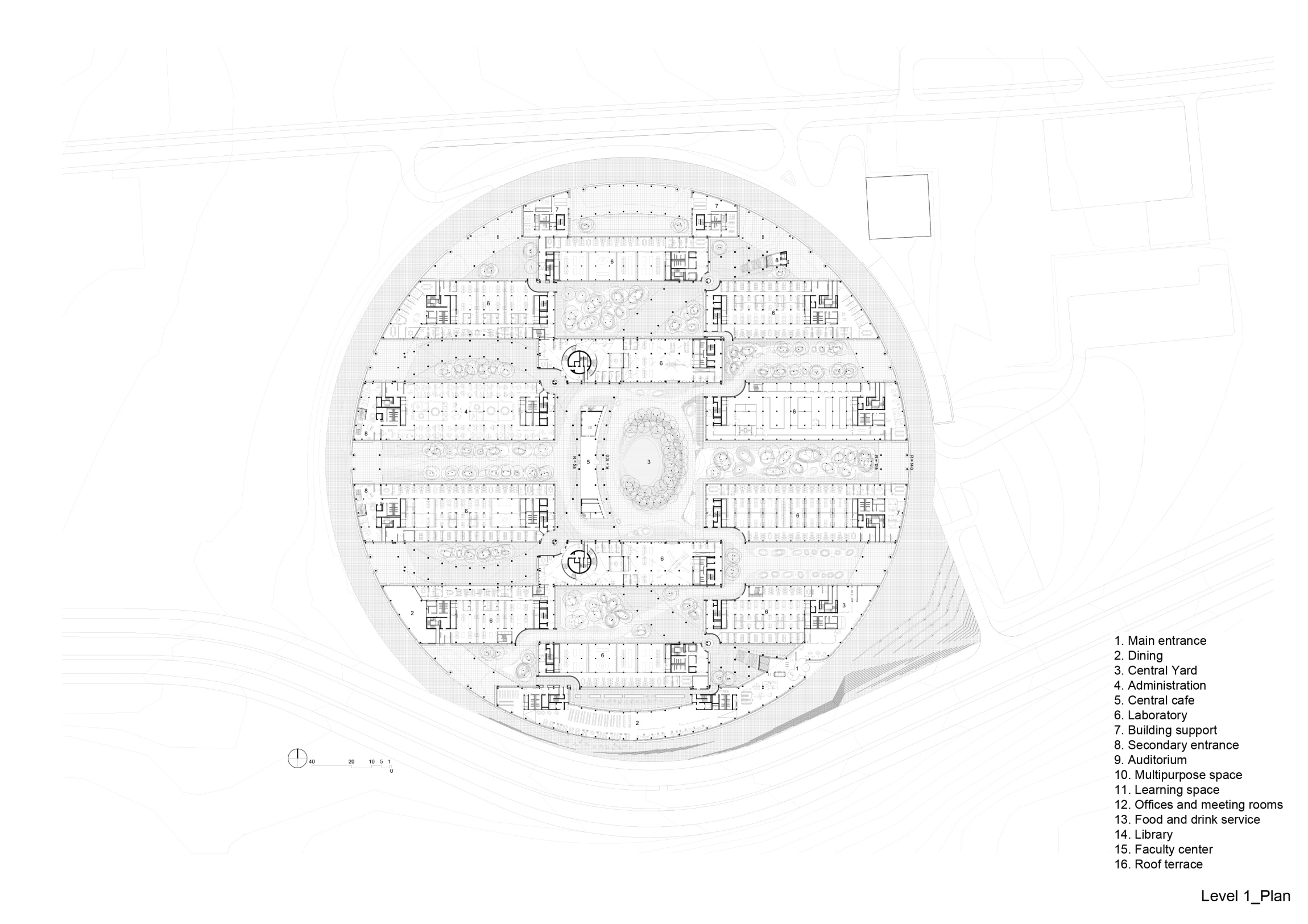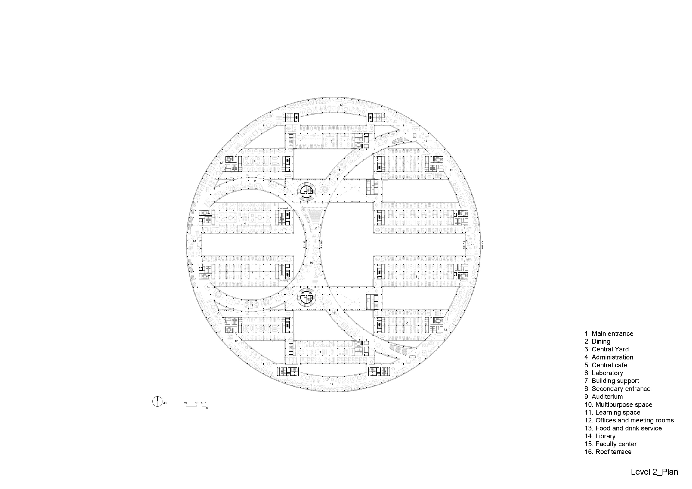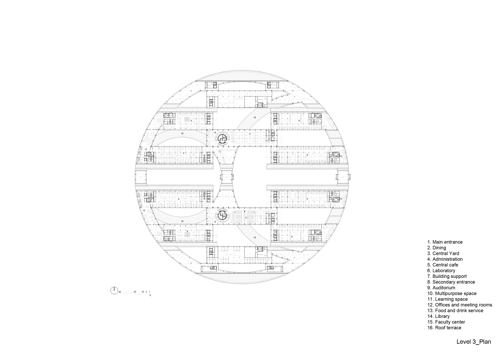 An outer ring of 280 metres diameter and two smaller inner rings host all the shared academic facilities and public spaces. The curved shapes connect all zones in a single loop. The outer ring accommodates the faculty offices, administration and meeting spaces, while the inner rings house the teaching and learning spaces, with the main auditorium at the central crossing point.