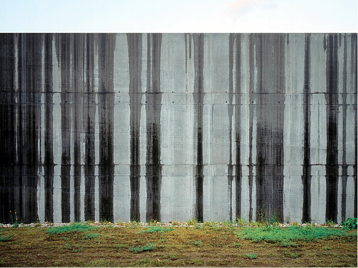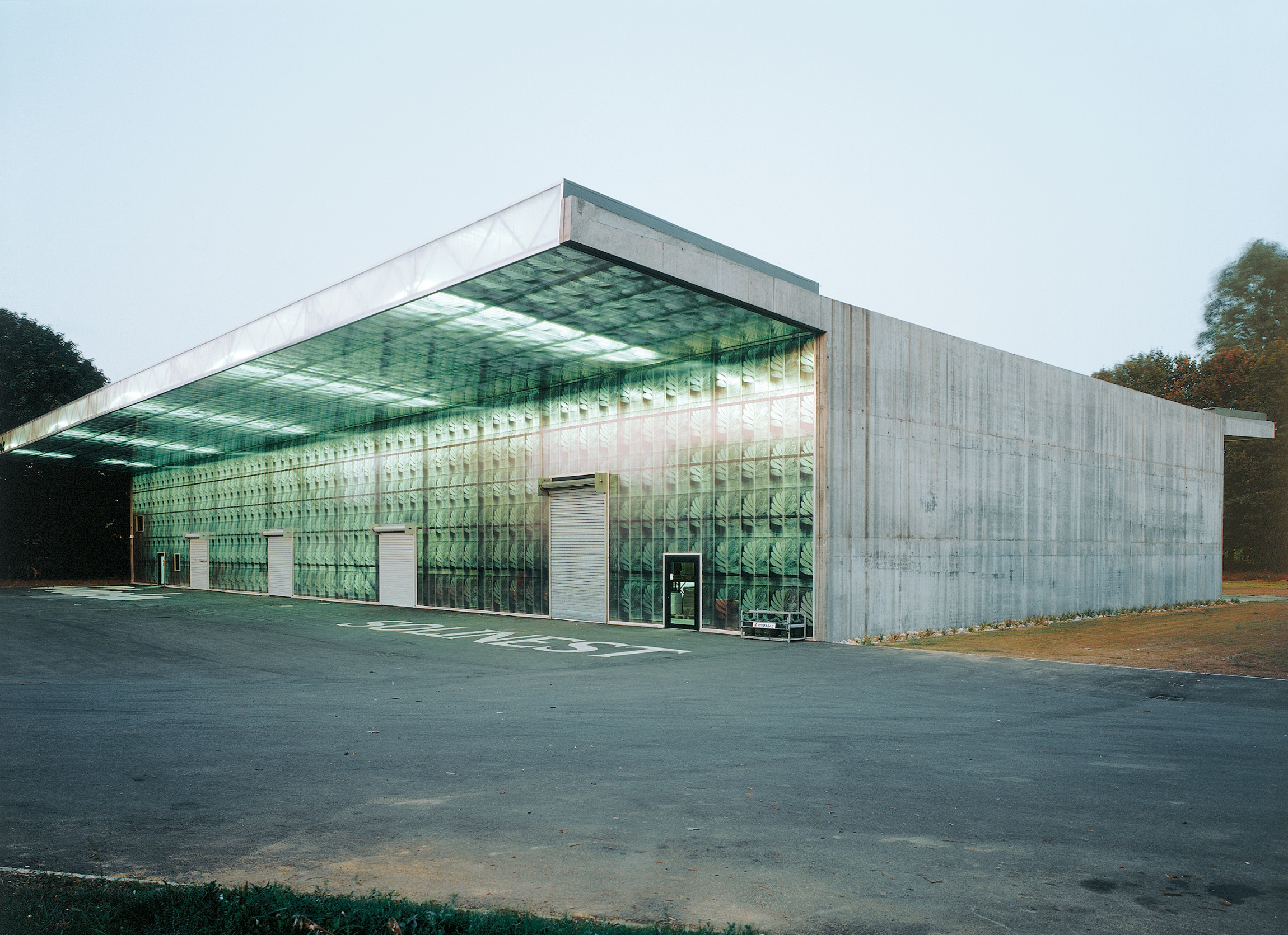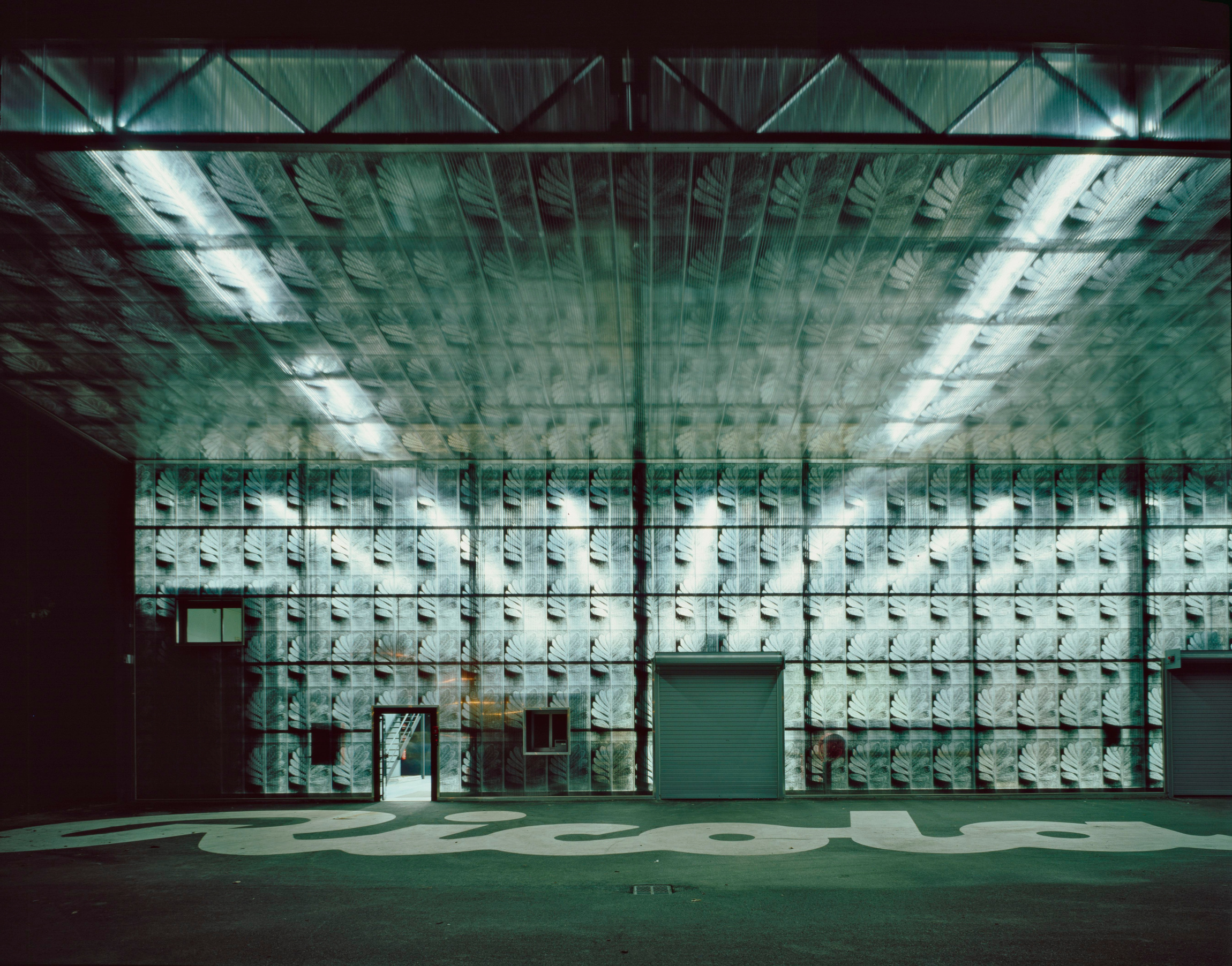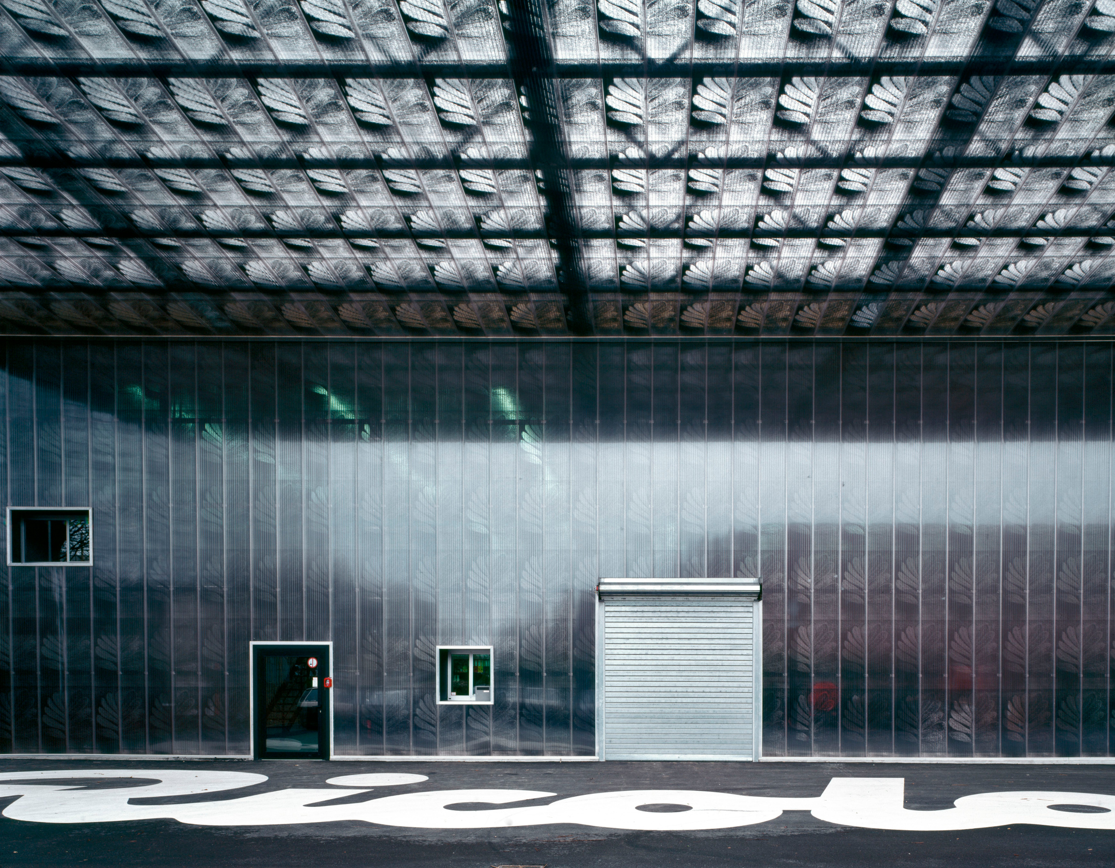 The short sides of the factory building are each closed by a black concrete wall. Water from the roof runs down over these black concrete walls and trickles into a deep bed of Alsatian gravel. The water running down the walls forms a fine film of plant life; a natural drawing ensues. Both long walls are light walls providing the work area with constant, pleasantly filtered daylight. Light filtering occurs through printed translucent polycarbonate façade panels, a common industrial building material. Using silkscreen, these panels are printed with a repetitive plant motif based on photograph’s by Karl Blossfeldt.
