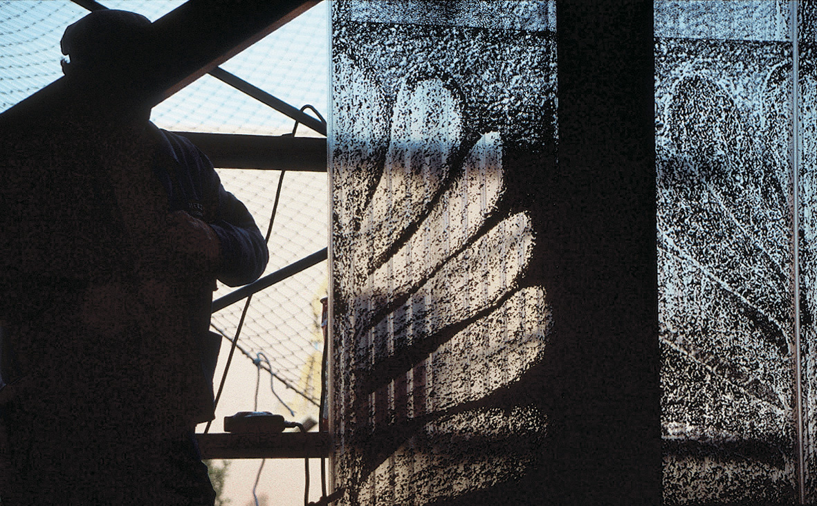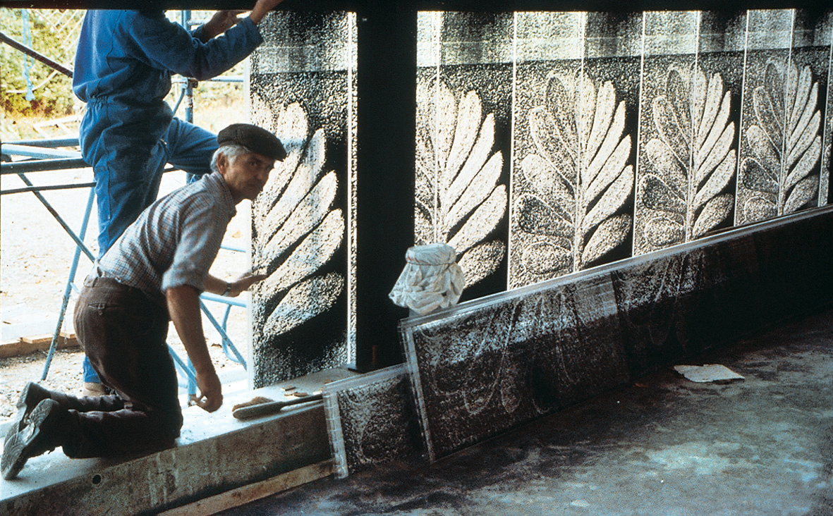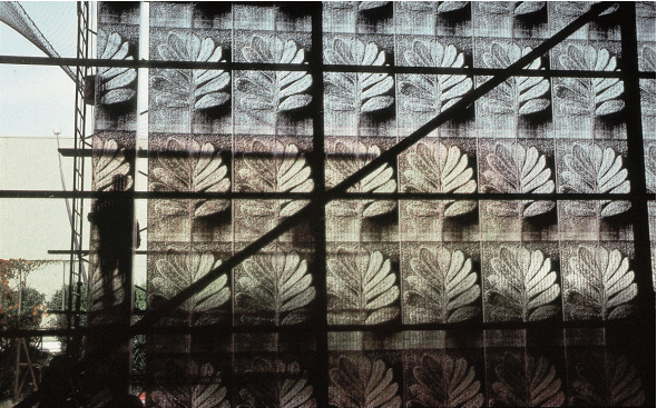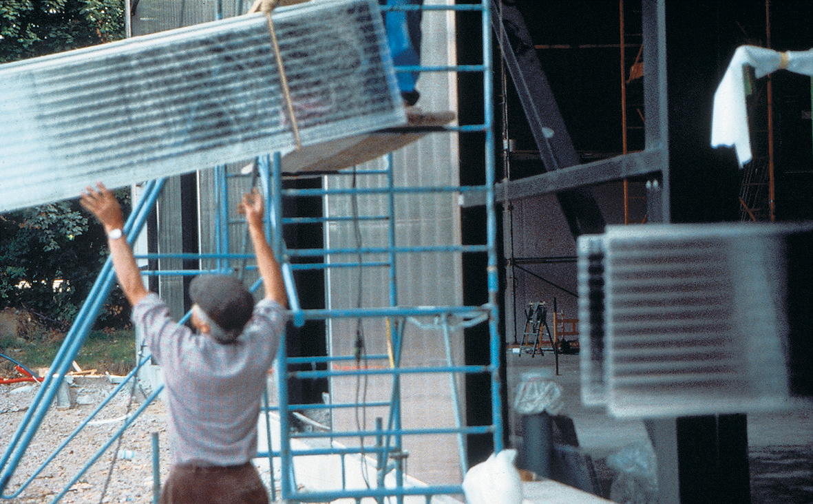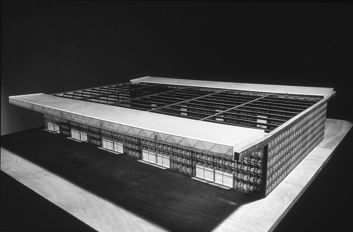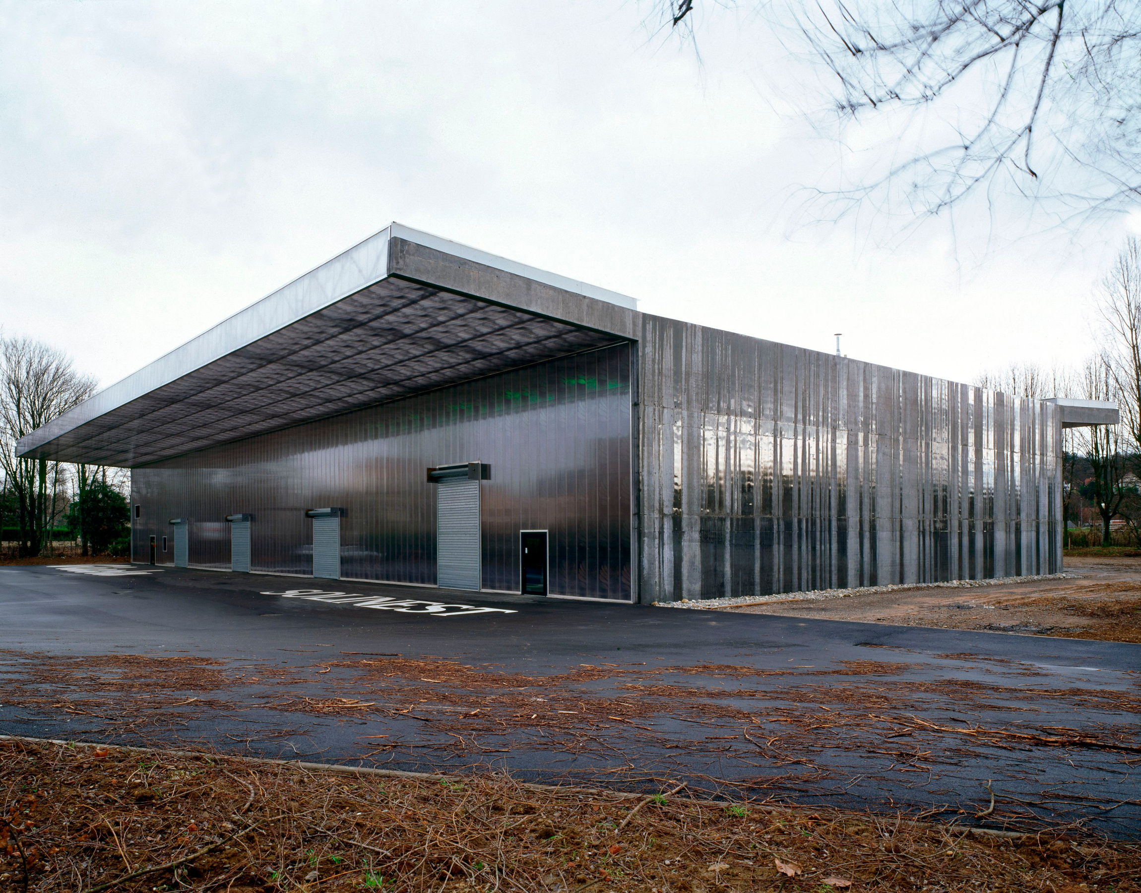 The short sides of the factory building are each closed by a black concrete wall. Water from the roof runs down over these black concrete walls and trickles into a deep bed of Alsatian gravel. The water running down the walls forms a fine film of plant life; a natural drawing ensues. Both long walls are light walls providing the work area with constant, pleasantly filtered daylight. Light filtering occurs through printed translucent polycarbonate façade panels, a common industrial building material. Using silkscreen, these panels are printed with a repetitive plant motif based on photograph’s by Karl Blossfeldt.