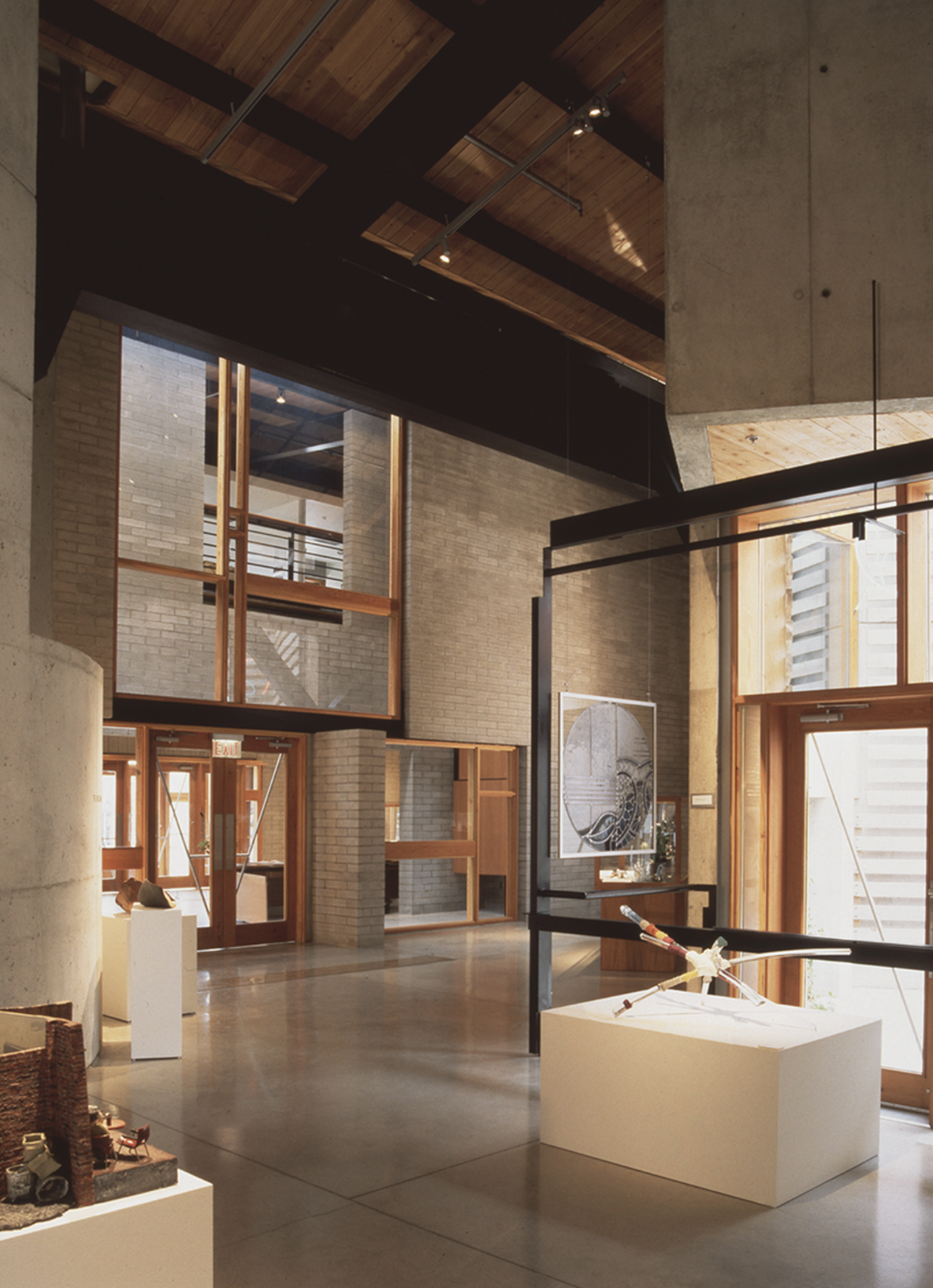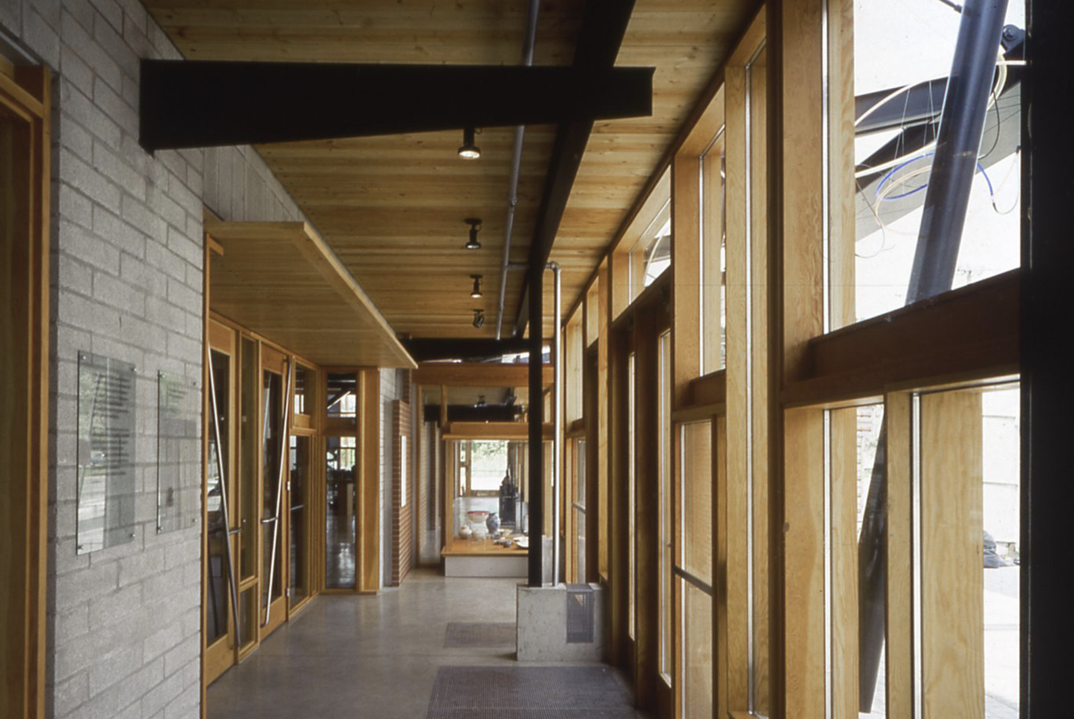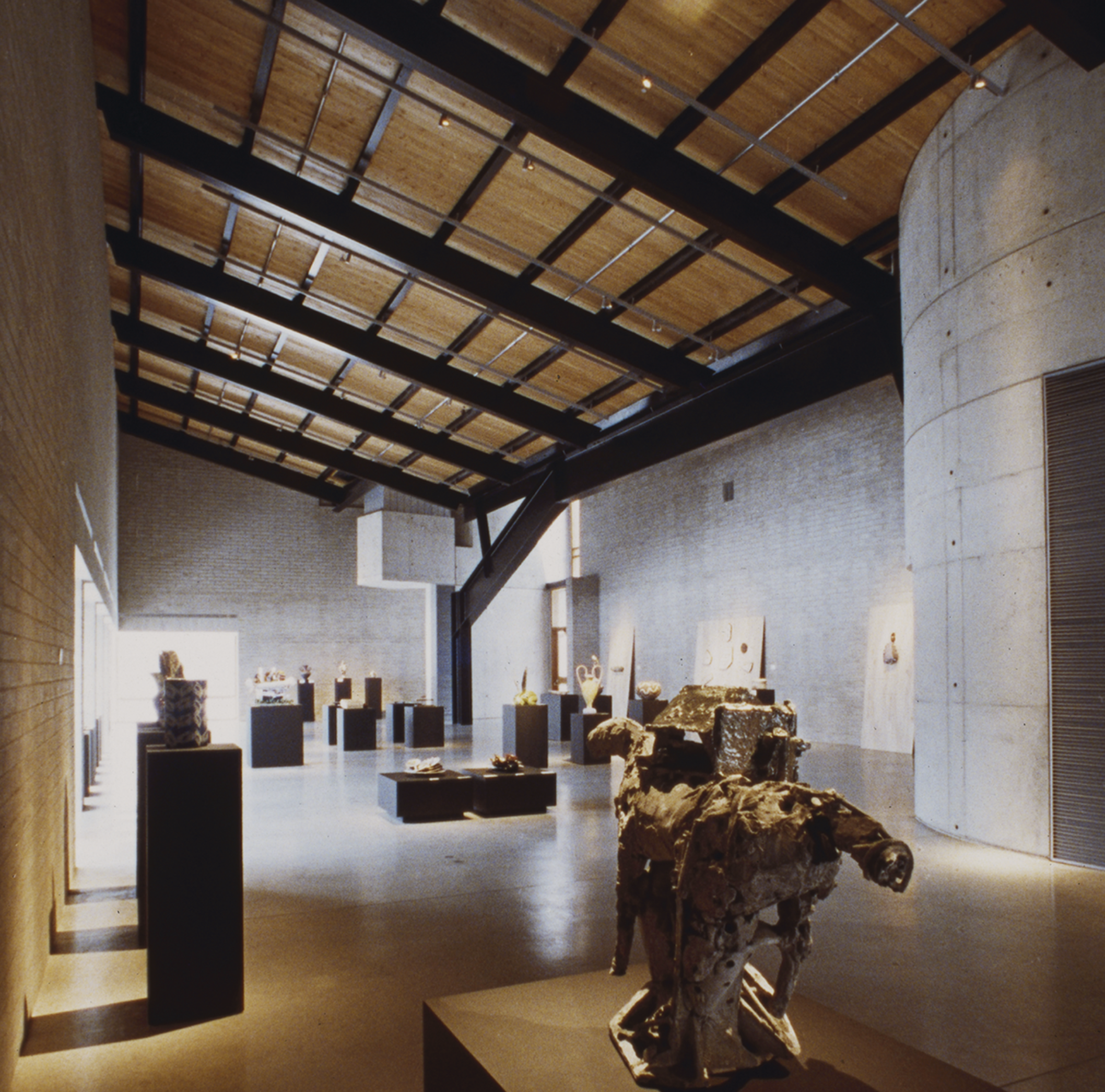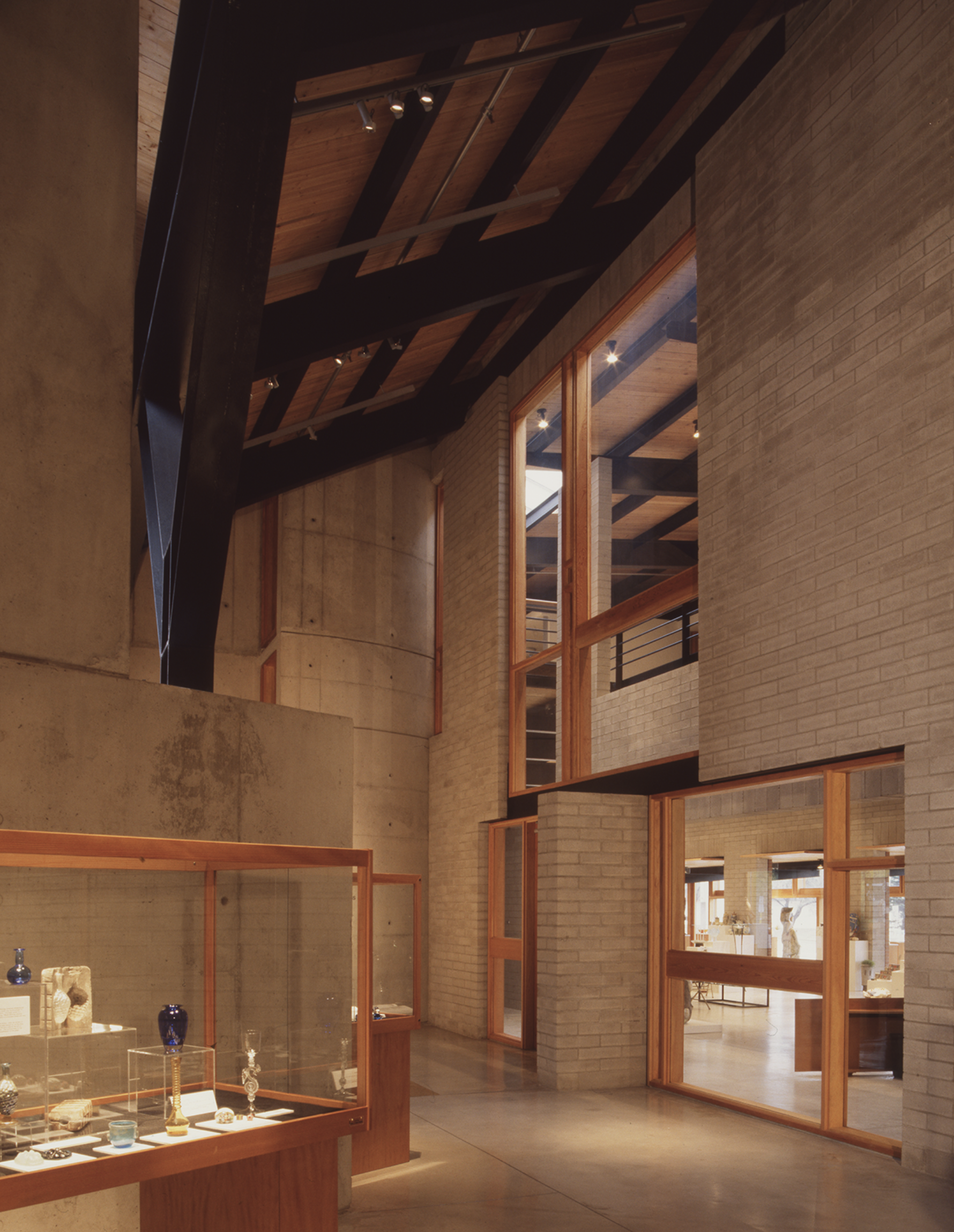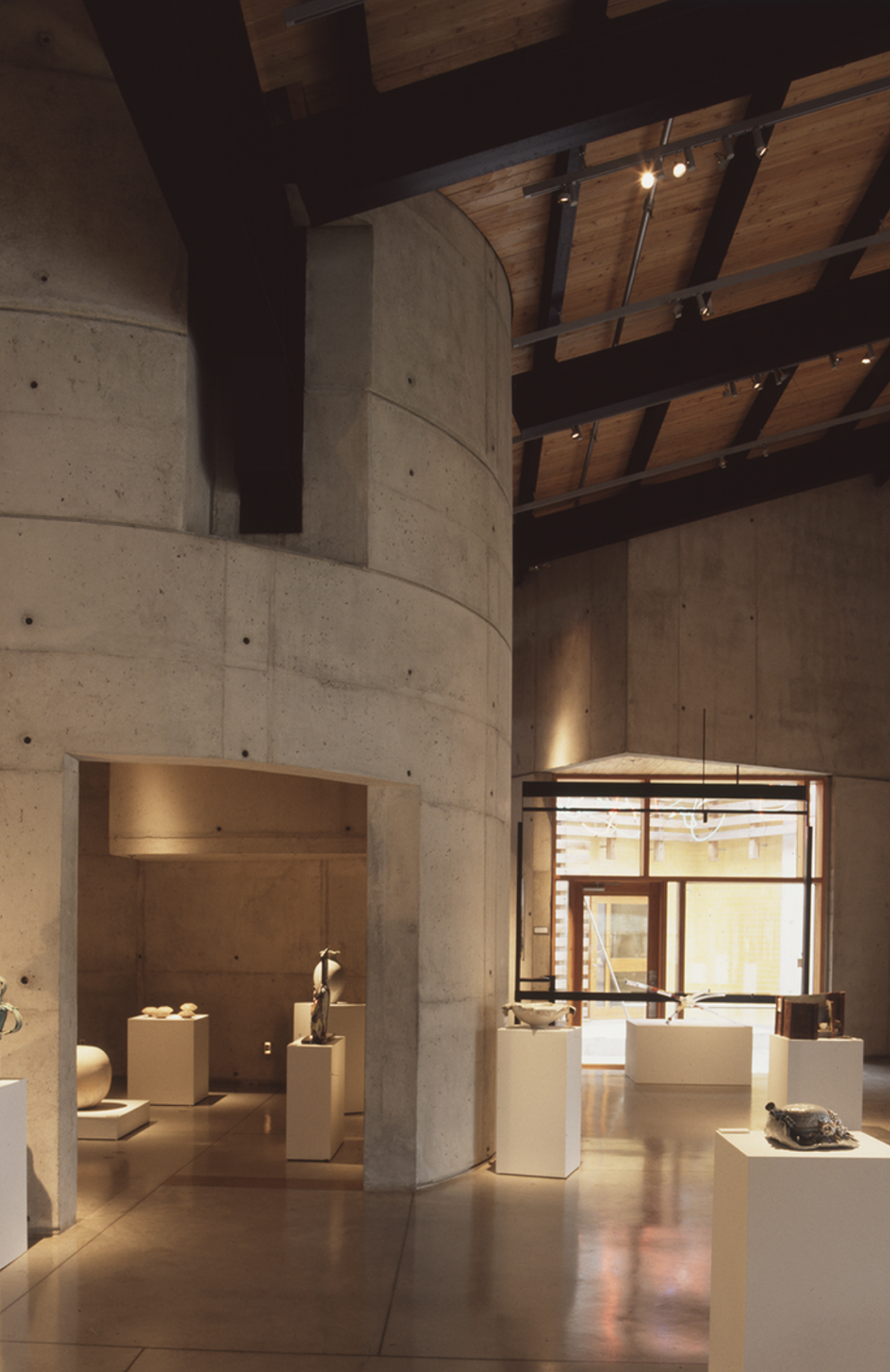 The design of this building takes advantage of the nature of clay and glass to provide an alternative to the white cube. First, the museum interiors are strongly connected to the outside world. Natural light from skylights, windows, and an exterior courtyard articulates the museum spaces and brings daily and seasonal cycles into the interior. Second, the construction of the museum interiors is not abstract but directly expressed: details reveal the layers of construction and articulate the relationships of materials to each other. In this way, the art objects displayed are connected to ordinary experiences so that they may be understood to be part of everyday life.