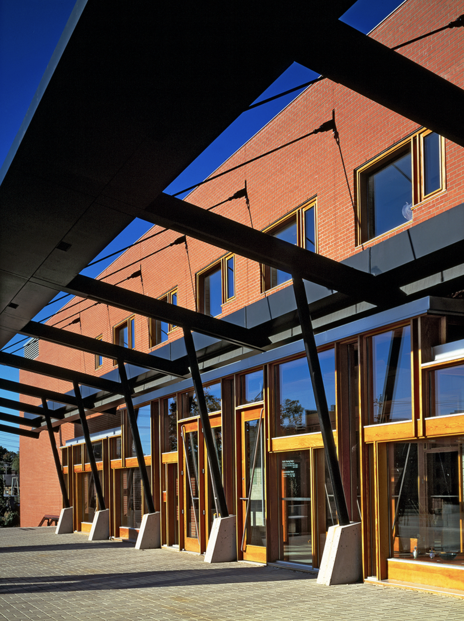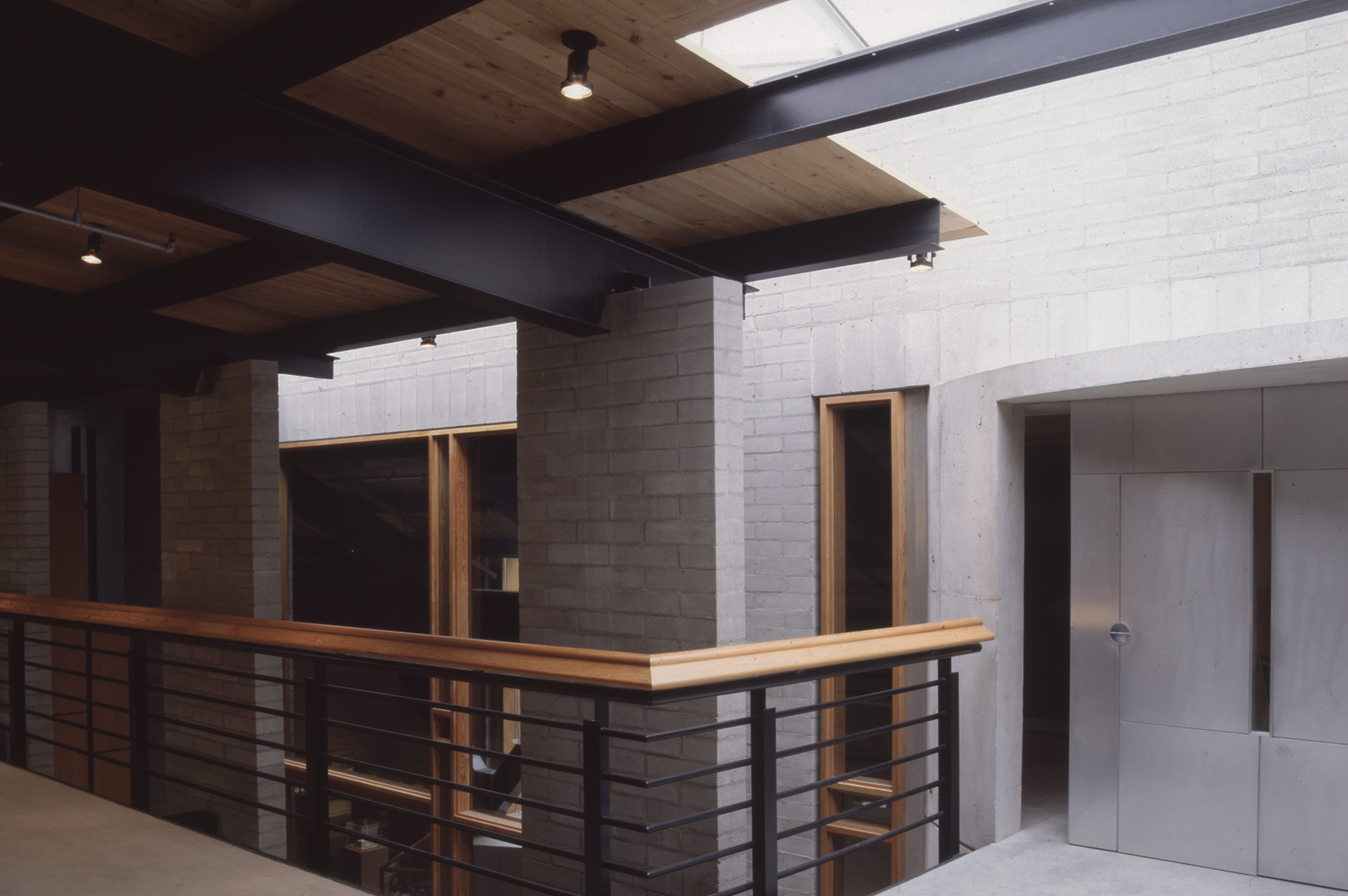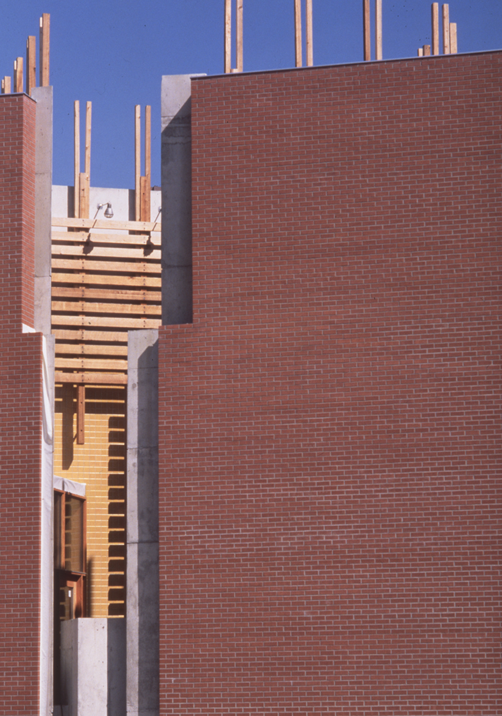 The construction of the museum reveals a simple hierarchy of building materials: The courtyard, small works, and tower galleries are reinforced concrete. The floor is also concrete, left exposed. Concrete masonry bearing walls, exposed to the interior, support roof and floor assemblies of wood decking on steel structure. On the exterior, walls are clad with brick veneer, detailed at openings to express the composite nature of the wall. Door and window frames are wood. |