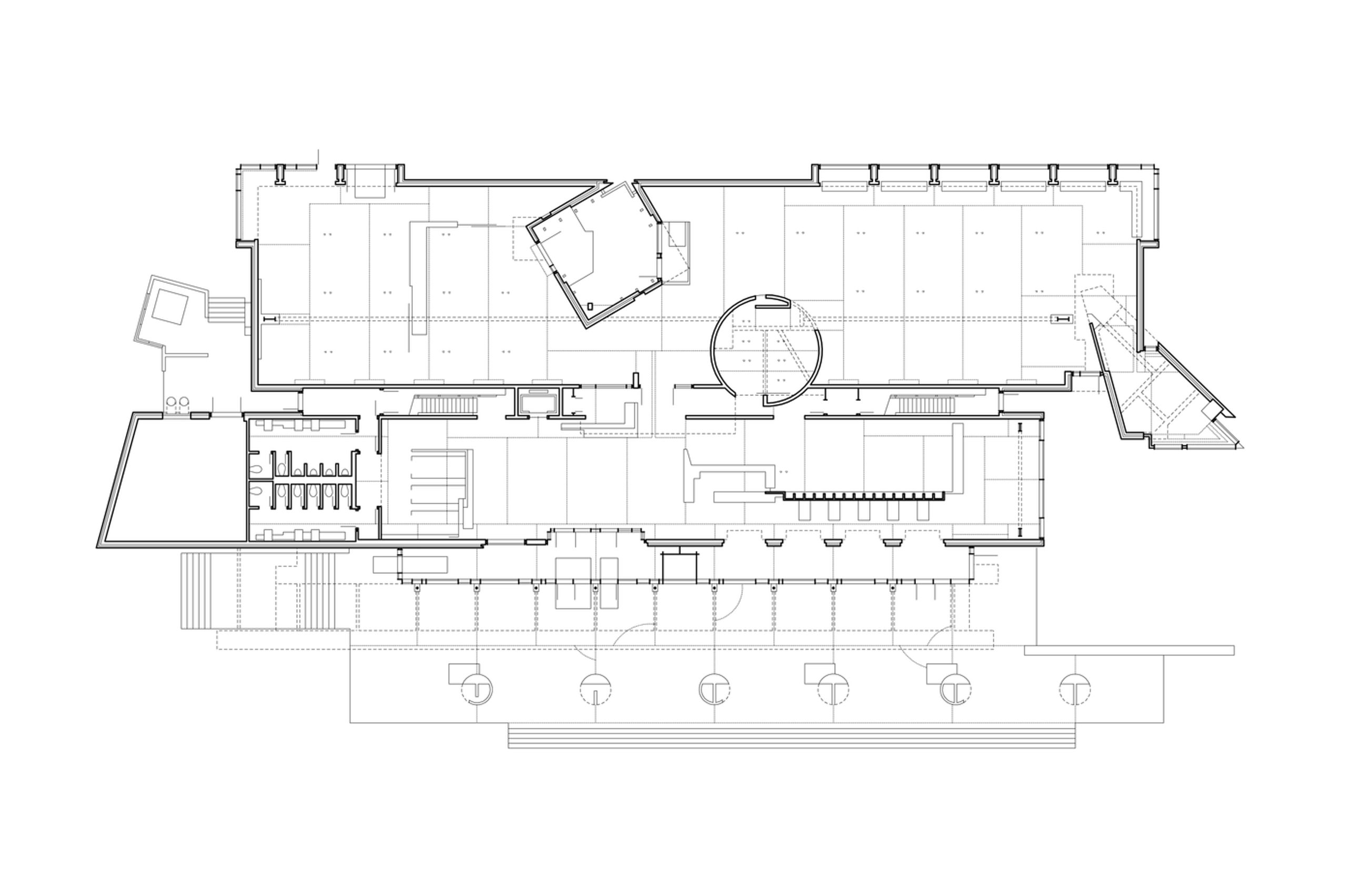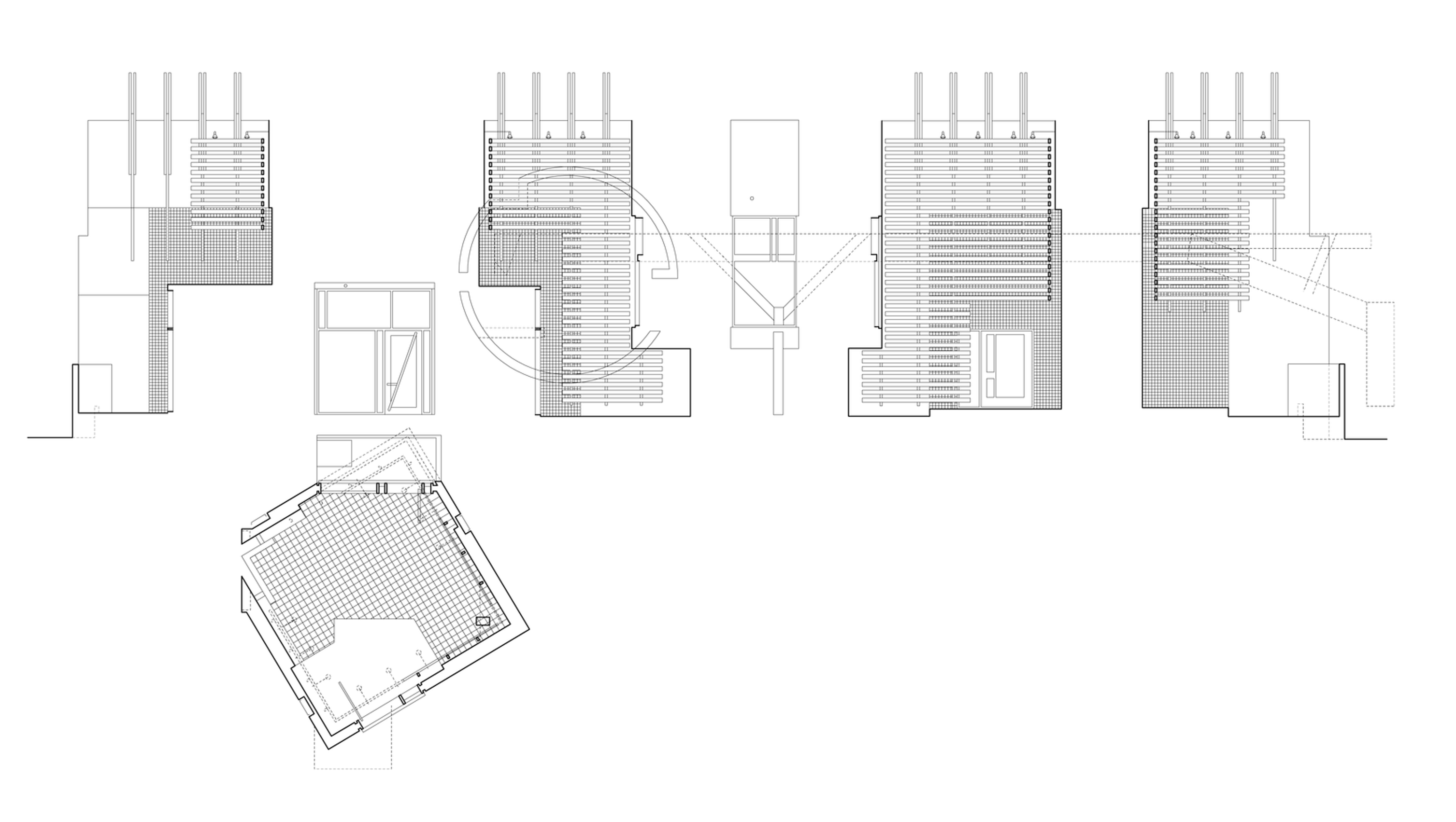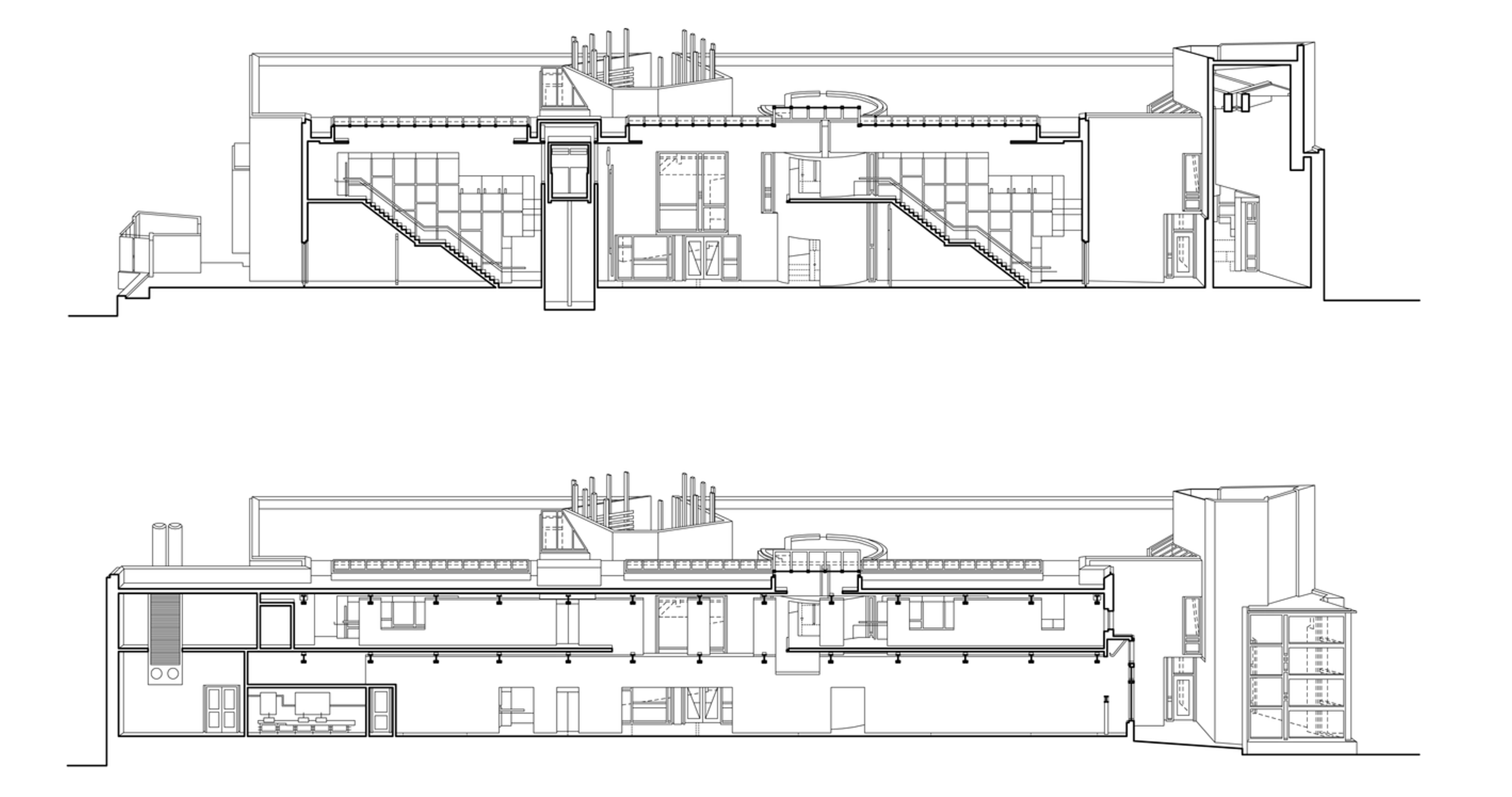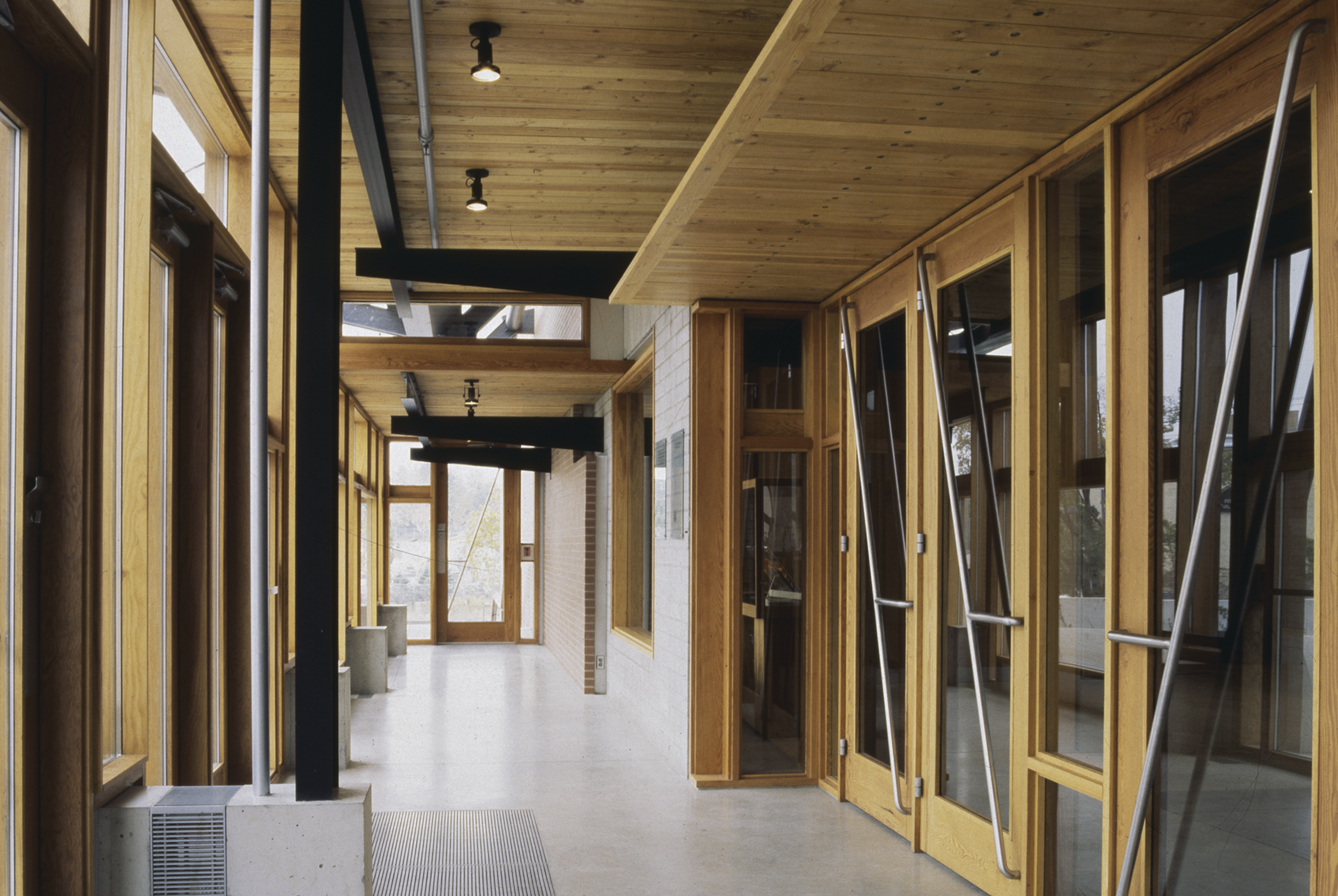 The construction of the museum reveals a simple hierarchy of building materials: The courtyard, small works, and tower galleries are reinforced concrete. The floor is also concrete, left exposed. Concrete masonry bearing walls, exposed to the interior, support roof and floor assemblies of wood decking on steel structure. On the exterior, walls are clad with brick veneer, detailed at openings to express the composite nature of the wall. Door and window frames are wood. |
