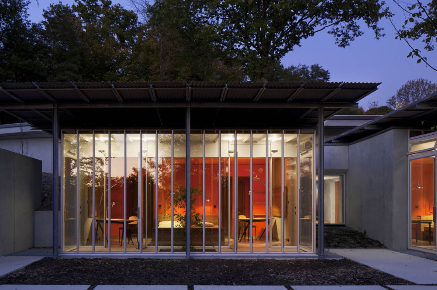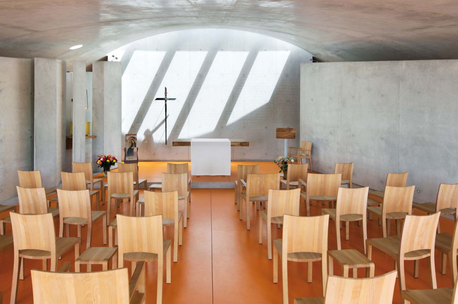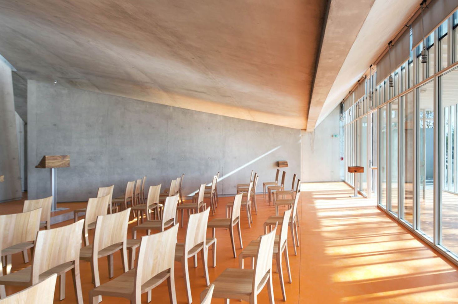 The convent is a small building made of pale cement that compliments the red Bourlémont rock that surrounds it. It is composed of a series of living units for the nuns with a common area and offices, and a linear building of the same size housing guest quarters. A small separate oratory built into a hill not far away also blends in with its surroundings. The building’s flat roofs are planted and from there you can see slender strips of zinc window awnings.