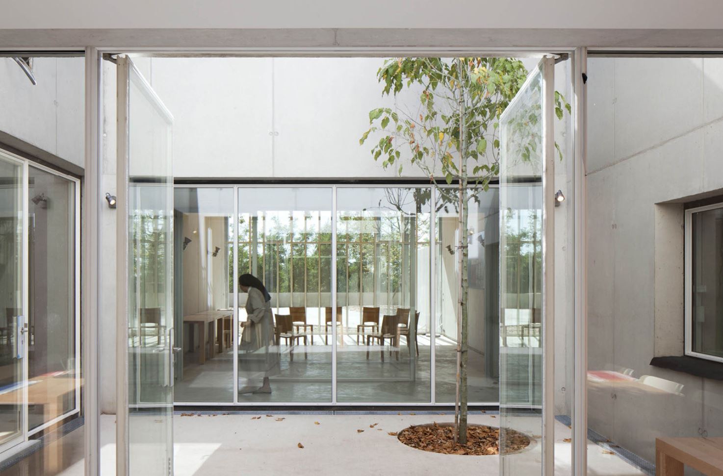 The Chapel of Notre Dame du Haut in Ronchamp was designed by Le Corbusier and is one of the 20th-century’s most important work of architecture. For years now, it has been a heavily frequented site of international cultural tourism. It was so frequented that the site needed urgent attention in order to restore the spirtual and religious dimension originally intended for Ronchamp by its architect. In a wider effort to improve the area, the Œuvre Notre Dame du Haut commissioned Renzo Piano Building Workshop to design a convent for the Poor Clare sisters, as well as a small new building to welcome visitors, the Porterie. Hugging the hill’s slope, the new buildings are protecteing architecture with a resolved interior featuring large picture windows that frame the woods and its light.