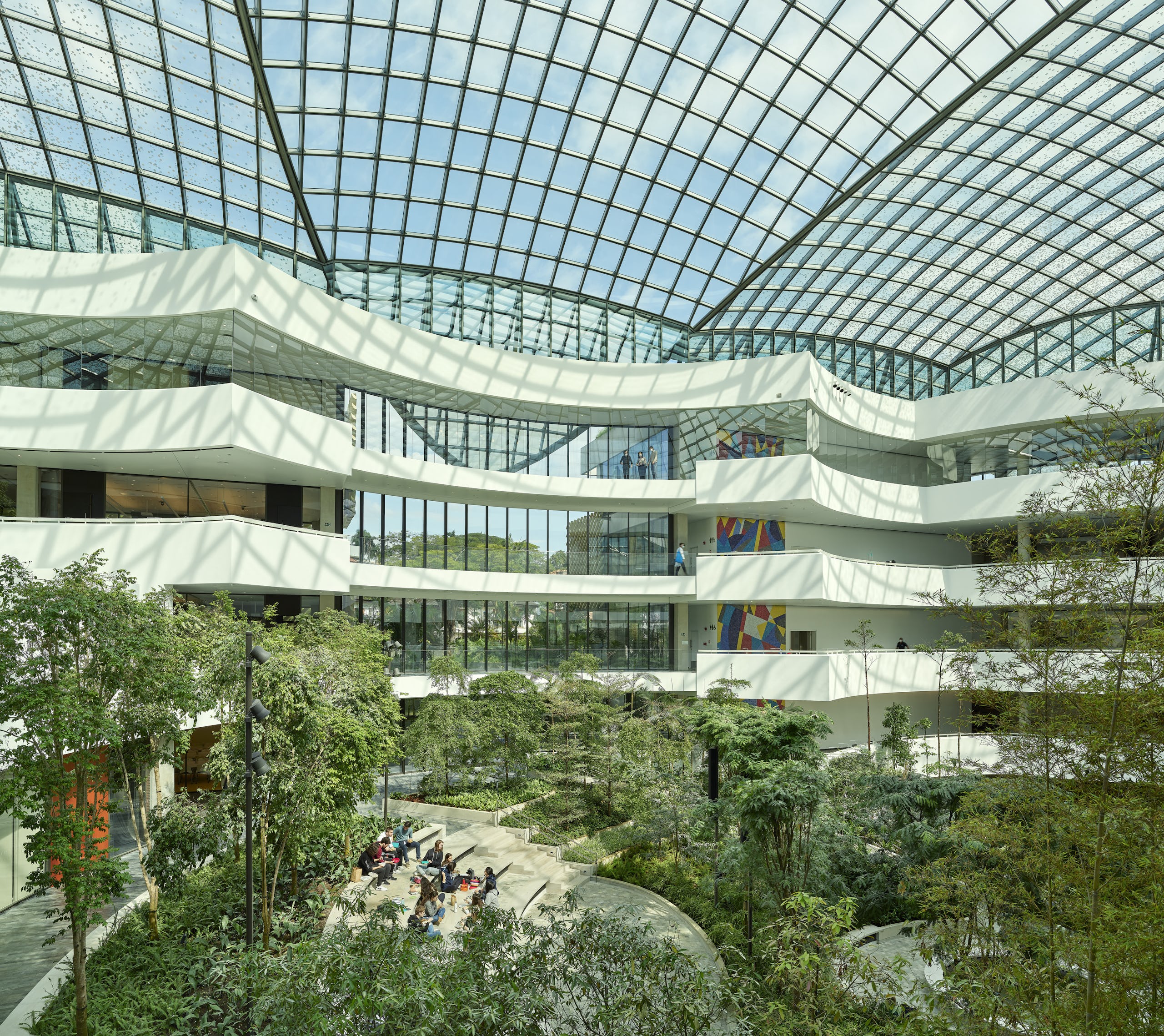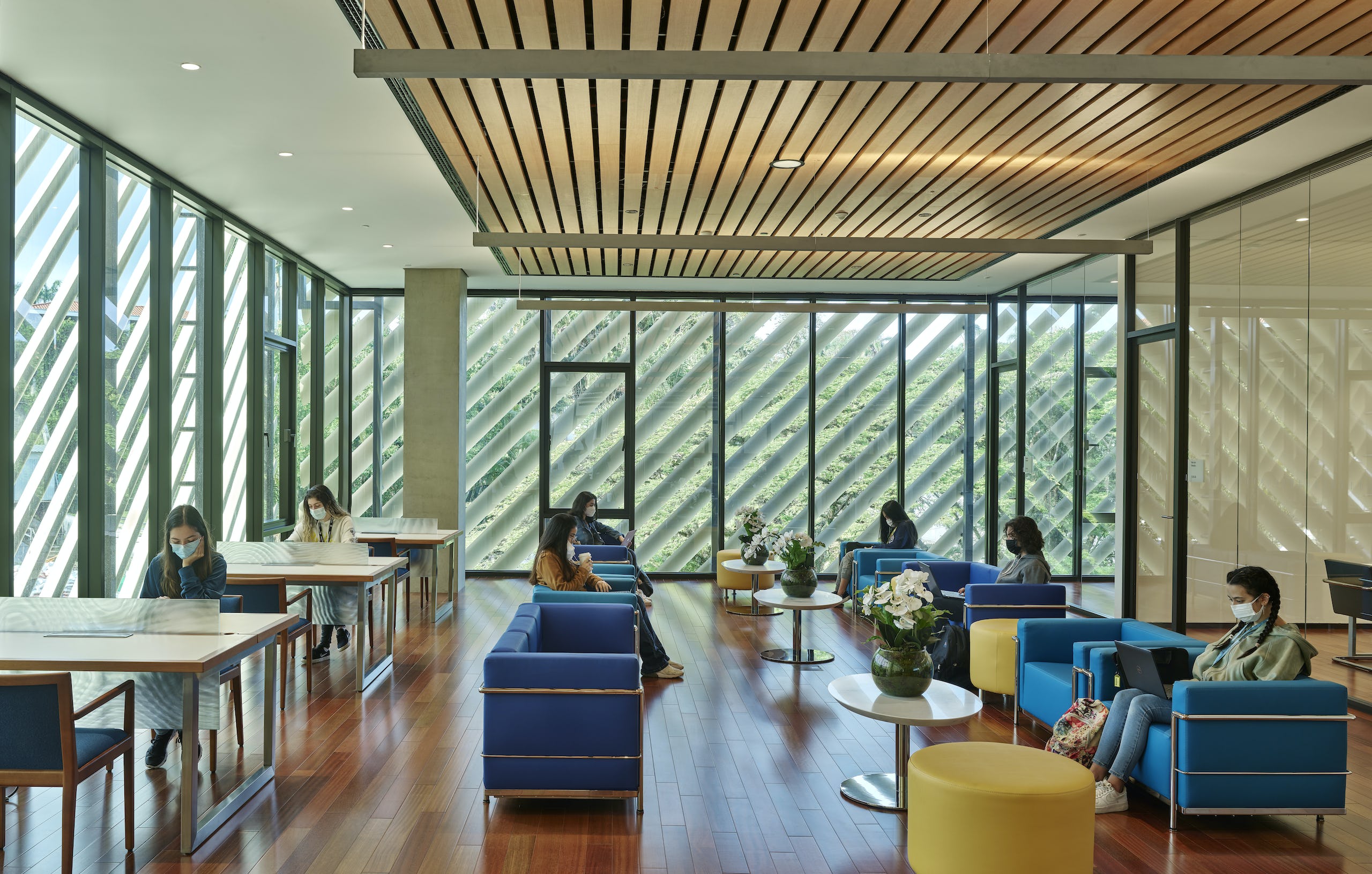 The spacious garden atrium is the physical and symbolic centerpiece of the building. Offering opportunities for spontaneous interaction, collaboration, and discovery, as well as repose and contemplation, the garden atrium serves as the community living room, visible from almost every corner of the building. The stepped terraces connect four main levels of activity, a restaurant on the first floor, amphitheater and auditorium on the center levels, and exhibition/event space on the fourth floor.